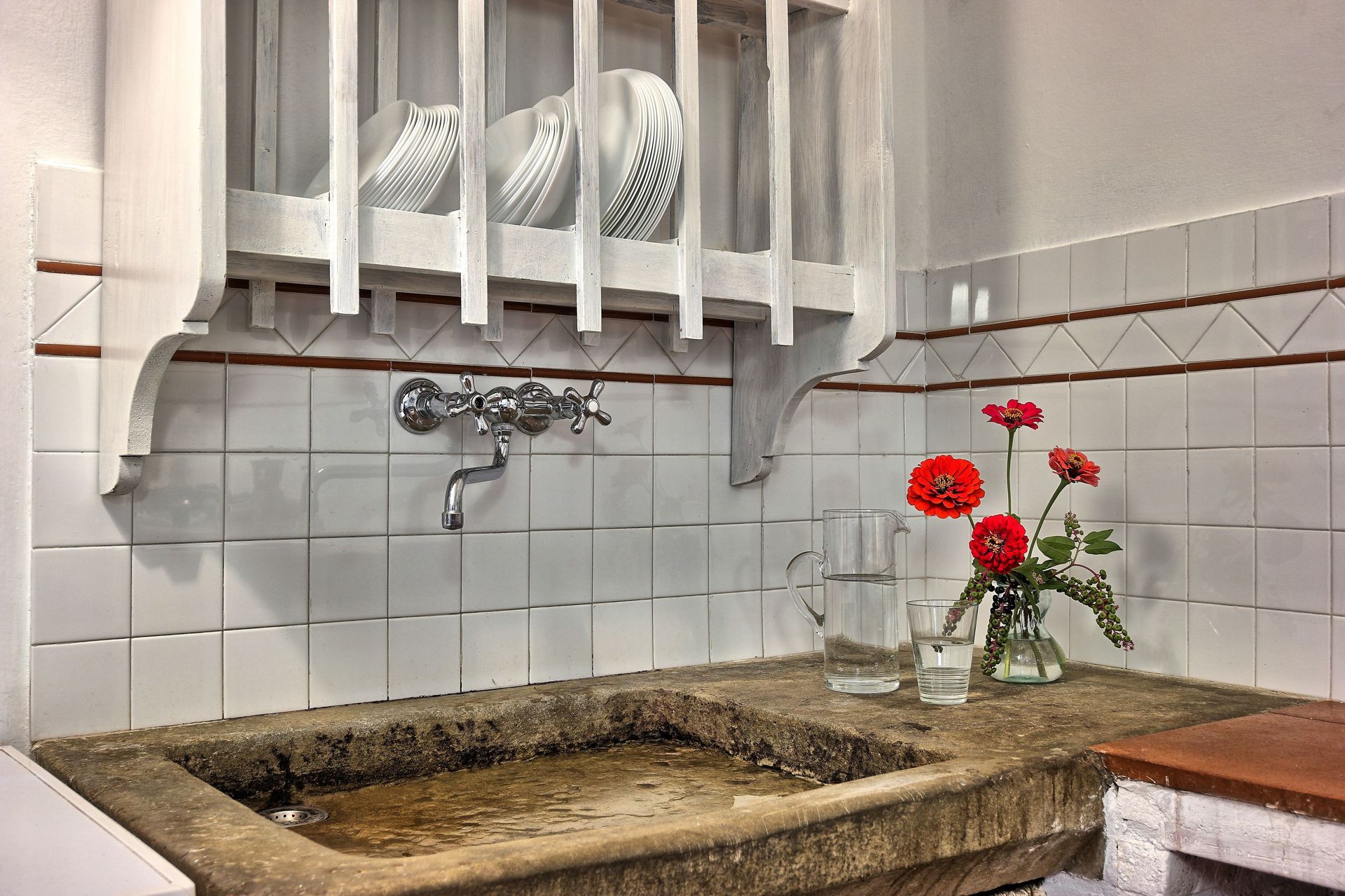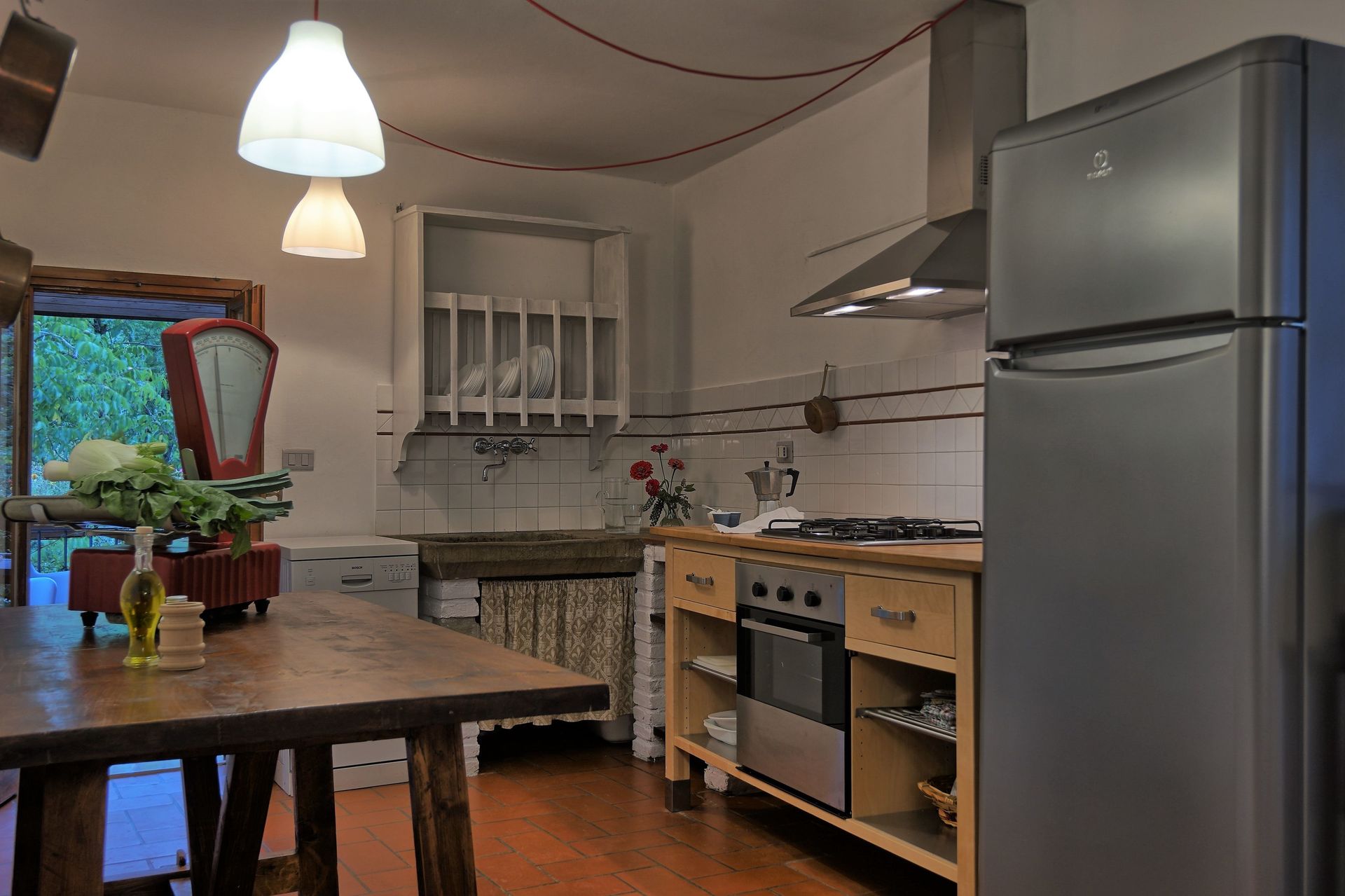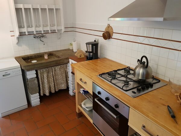 De keuken heeft een vaatwasser, fornuis, oven, ijskast en magnetron. De originele stenen wasbak is antiek. Alles wat u nodig heeft om te koken is aanwezig. In de eetruimte binnen is er plaats voor 4 personen.