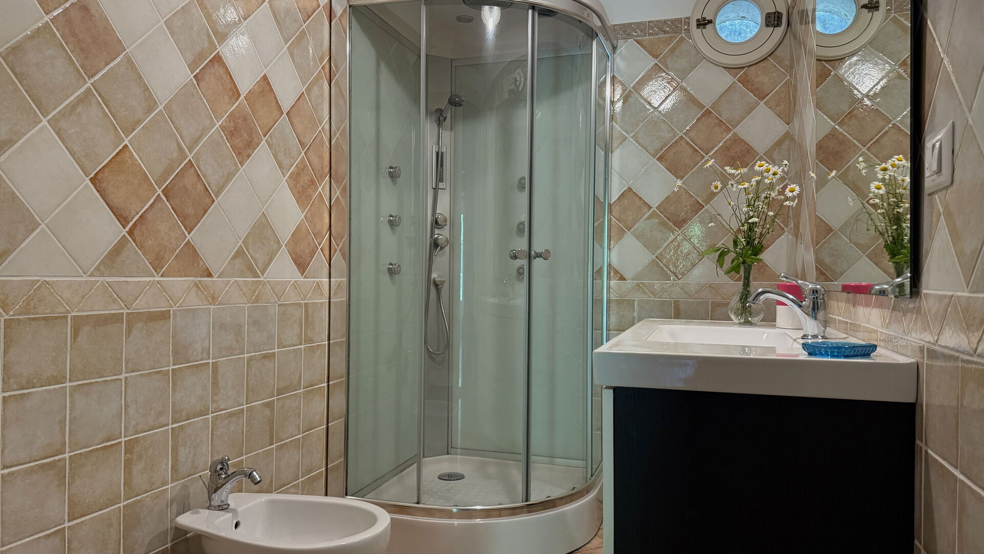 Badkamer: bubbelbad, wastafel, toilet , bidet, douche.