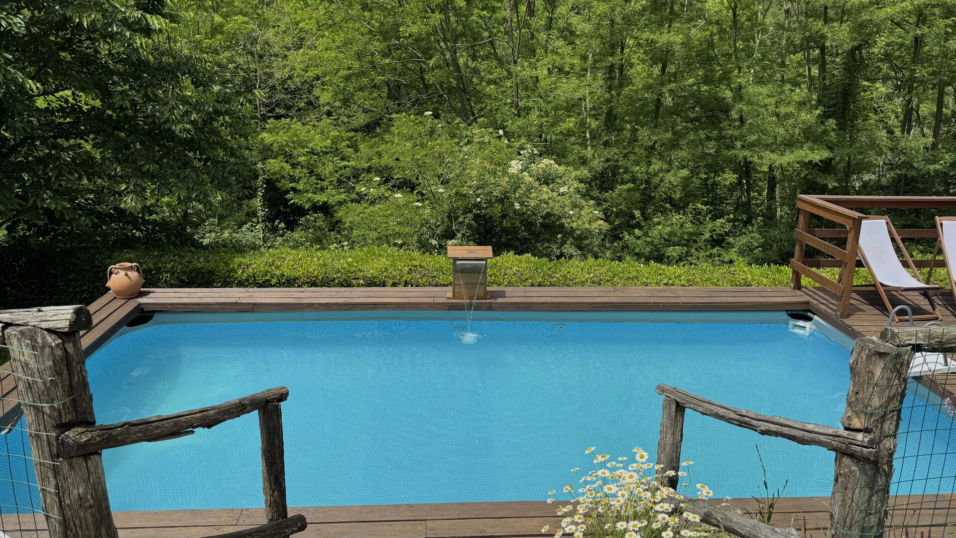 Tuin: zwembad (breedte: 3.8m, lengte: 7.3m, diepte: 1.2m), barbecue, dineren in de buitenlucht, tuinmeubilair, vier ligstoelen.