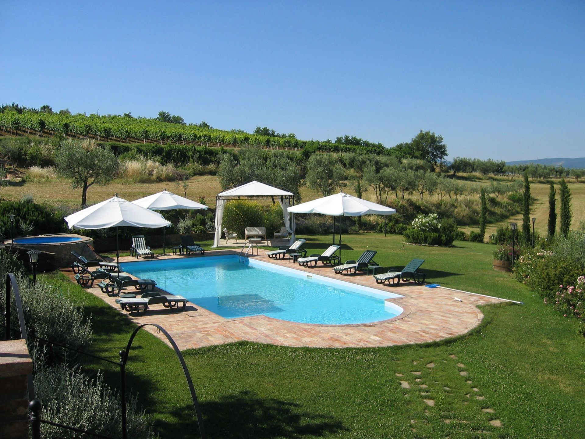 Ter beschikking van de gasten: groot schaduwrijk grasveld met tafels, stoelen, ligstoelen, barbecue en tafeltennis, overdekt terras met mooi uitzicht over land en tuinmeubilair, privé zwembad in panoramische positie (6 x 14 m – max. diepte 1,5 m – open van 01/04 tot 31/10) met kleedhok en 2 douches, zwembad voor kinderen met hydromassage-hoek.