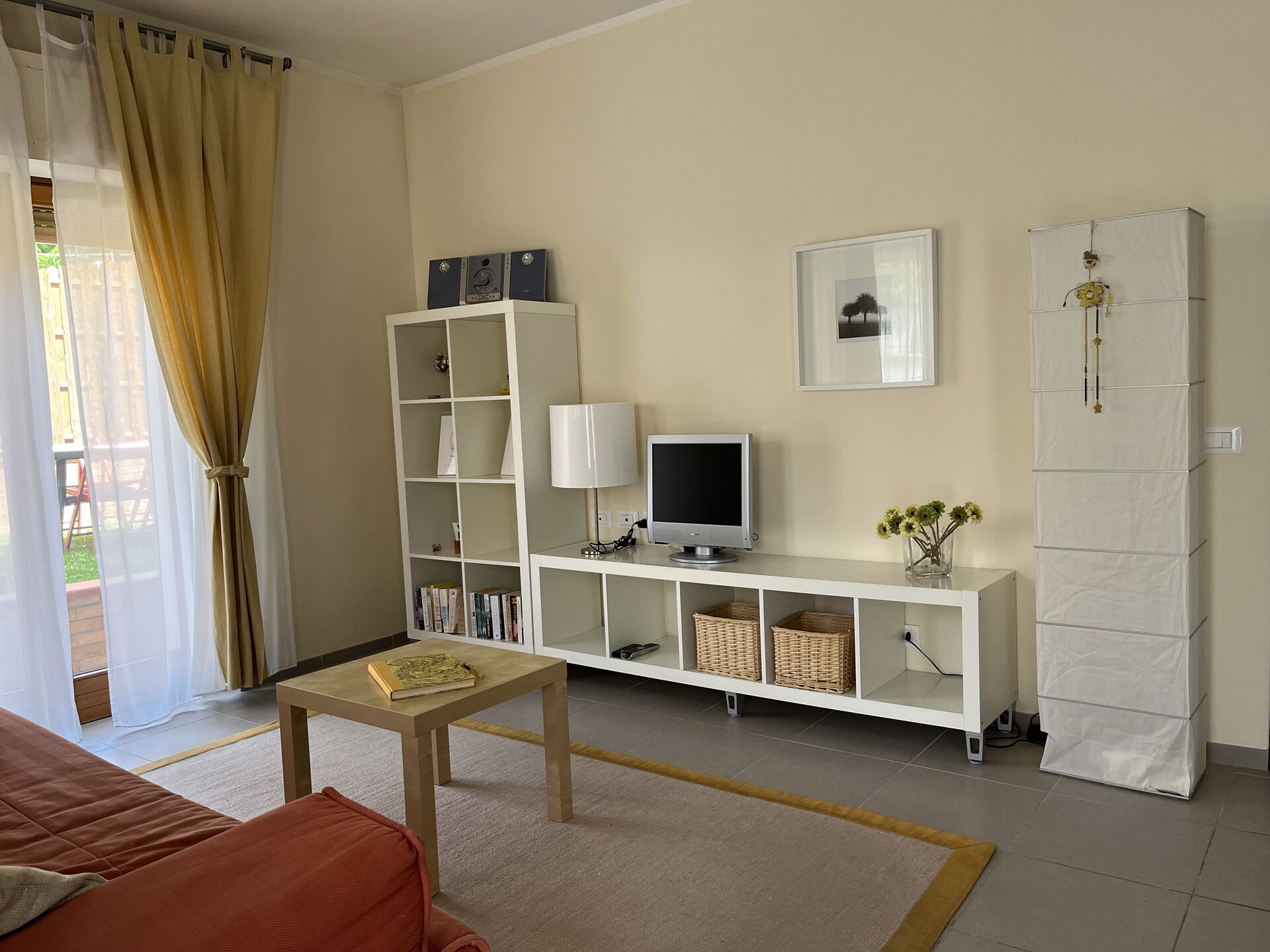 Keuken – woonkamer (25 m2): goed uitgeruste keuken, eettafel (personen: 6), vaatwasser, ijskast, diepvriezer, oven, broodrooster, strijkijzer, wasmachine, slaapbank (breedte: 2m, lengte: 1.6m), WIFI internet, tv, ventilator, uitgang naar de tuin.