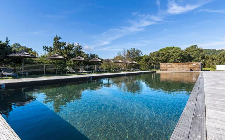 Het gedeelde park van 5 hectare is volledig omheind en biedt een uitgestrekt en goed onderhouden natuurgebied, ideaal voor wandelingen en ontspanning in de buitenlucht. Het verwarmde zwembad meet 24 x 7 meter met een diepte van 60 tot 170 cm en is beschikbaar van 15 april tot 1 november; het wordt regelmatig onderhouden door de tuinman van de eigenaar. Een buitendouche is aanwezig voor gasten die terugkeren van het strand of zwembad. De tuin van het pand biedt een aangenaam buitenruimte waar gasten kunnen ontspannen in de rustige omgeving van het Corsicaanse platteland.