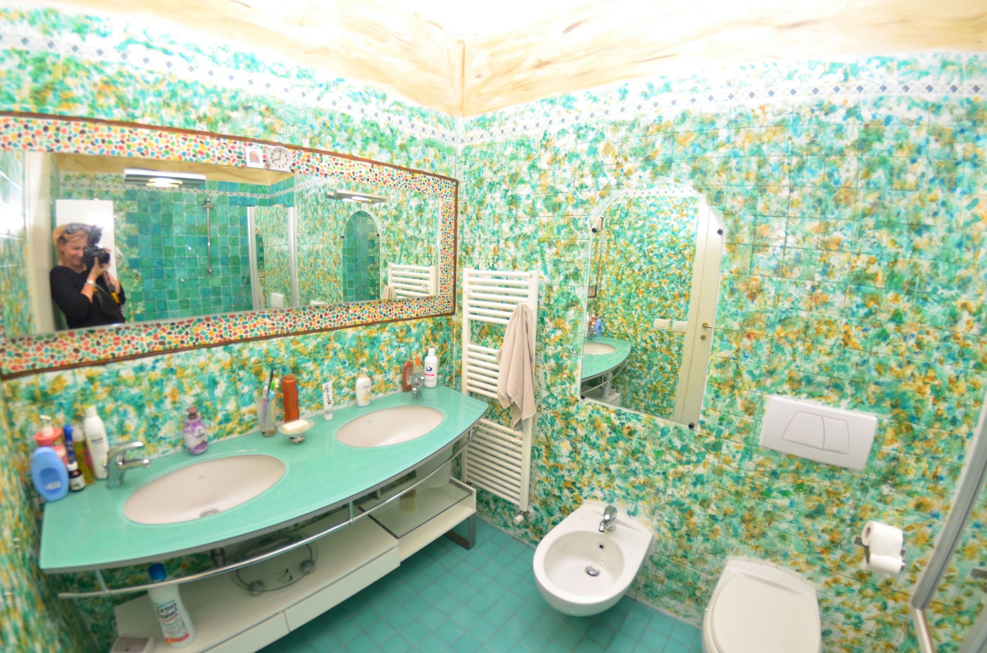 Badkamer: dubbele wastafel, toilet , bidet, bad.
