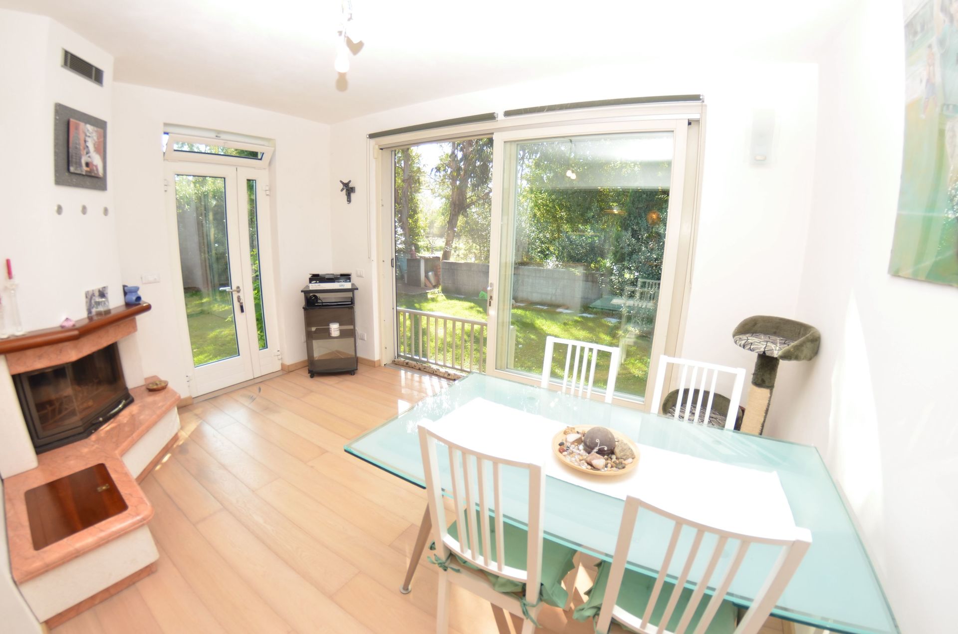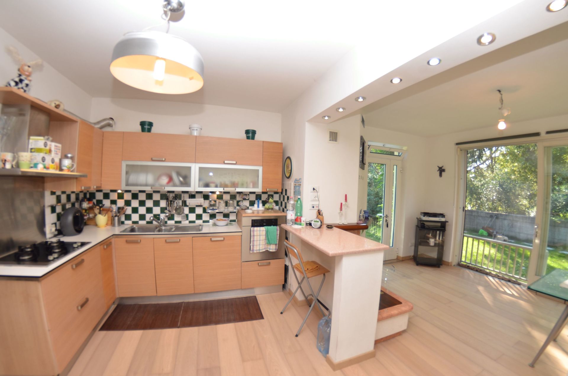 Keuken: eettafel, vaatwasser, ijskast, diepvriezer, magnetron, kookplaat, oven, koffiezetapparaat, wasmachine, open haard, uitgang naar de tuin.