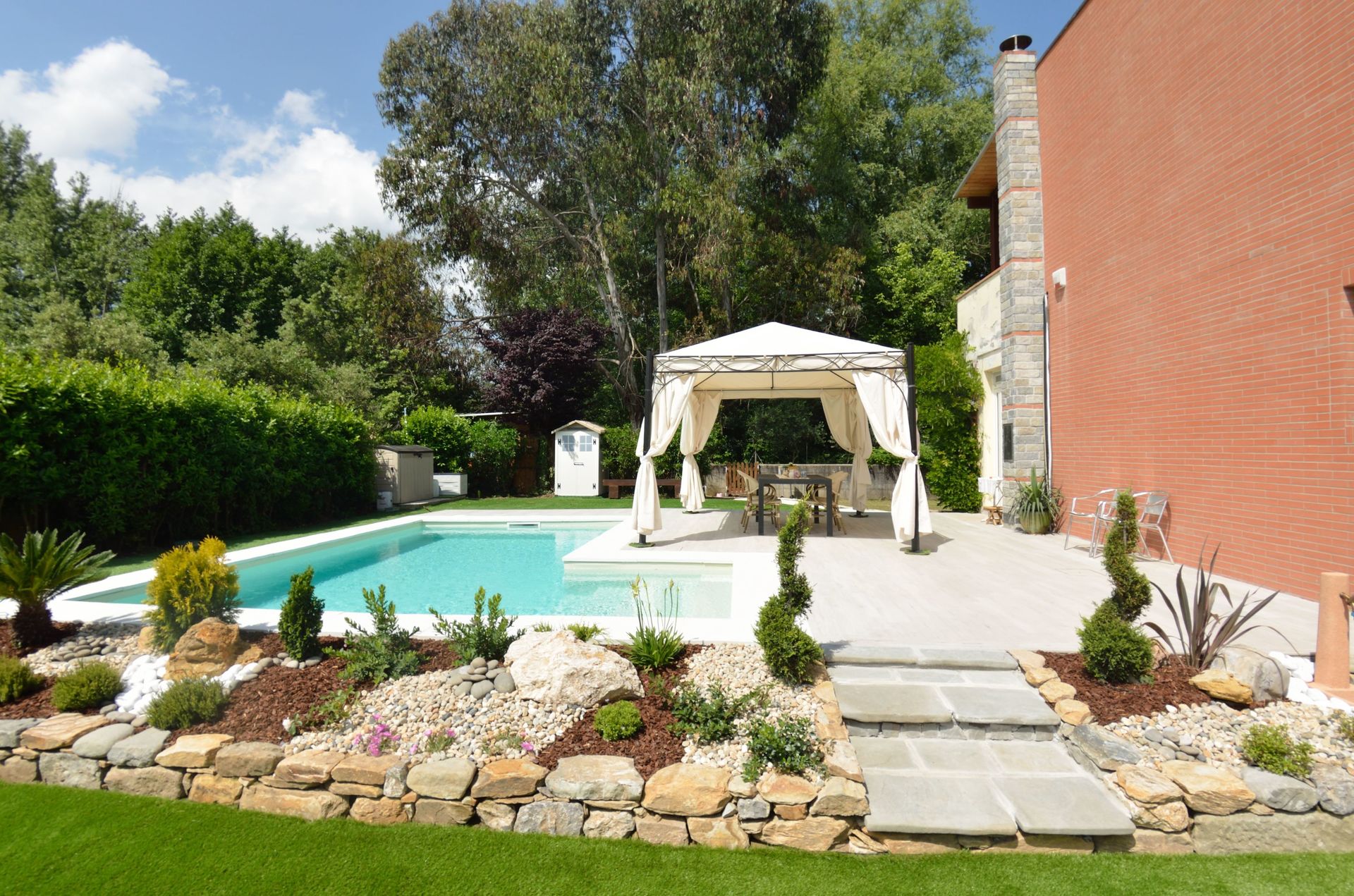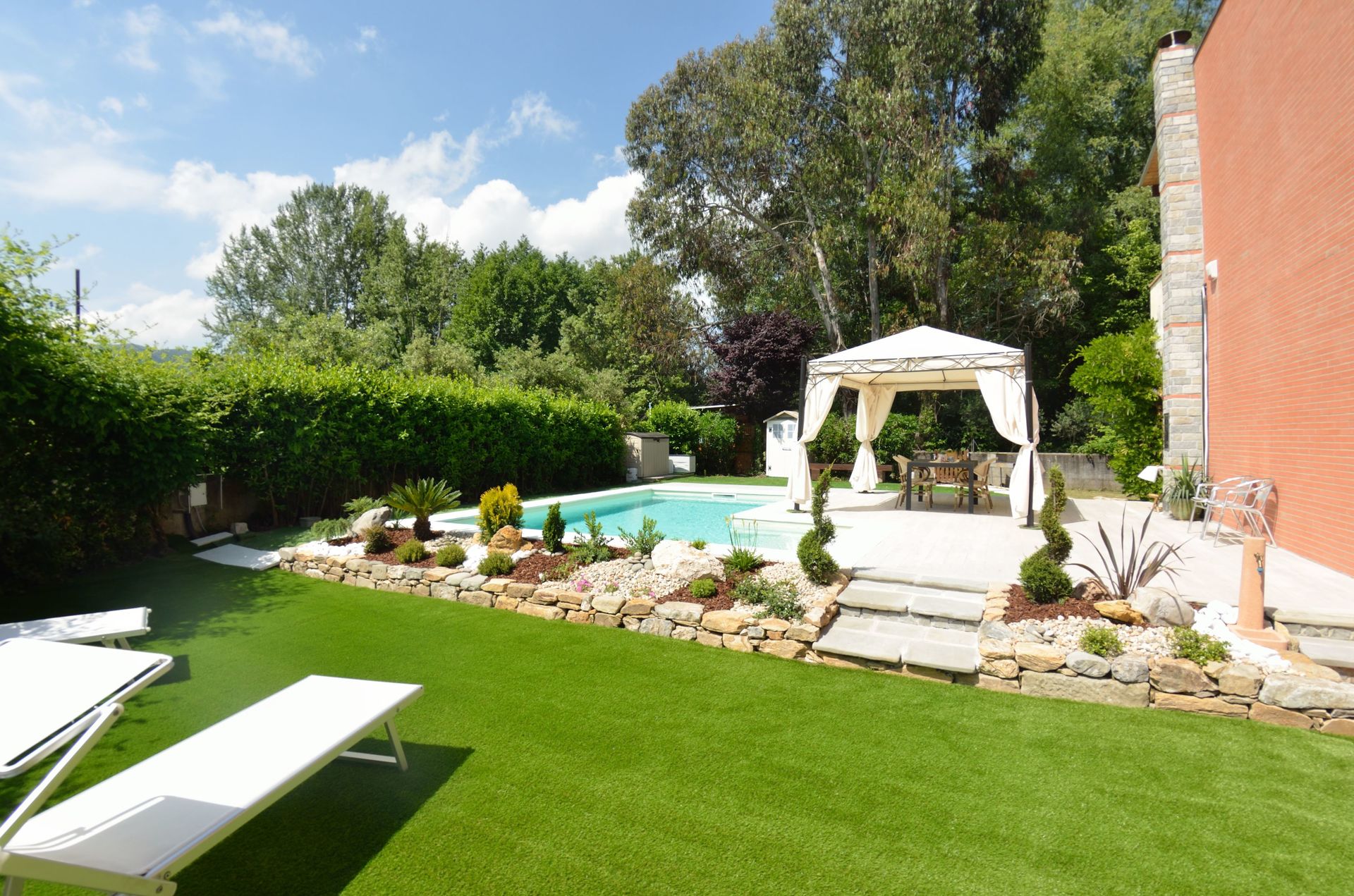 Tuin: zwembad (breedte: 3m, lengte: 6m, diepte: 1.4m), barbecue, dineren in de buitenlucht, eettafel (personen: 6), gazebo, tuinmeubilair, twee ligstoelen, omheind grondstuk.