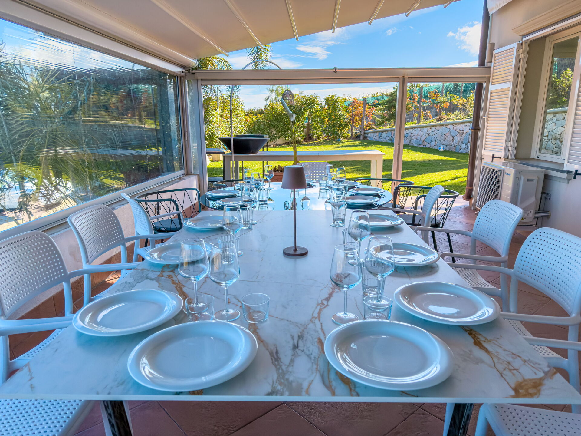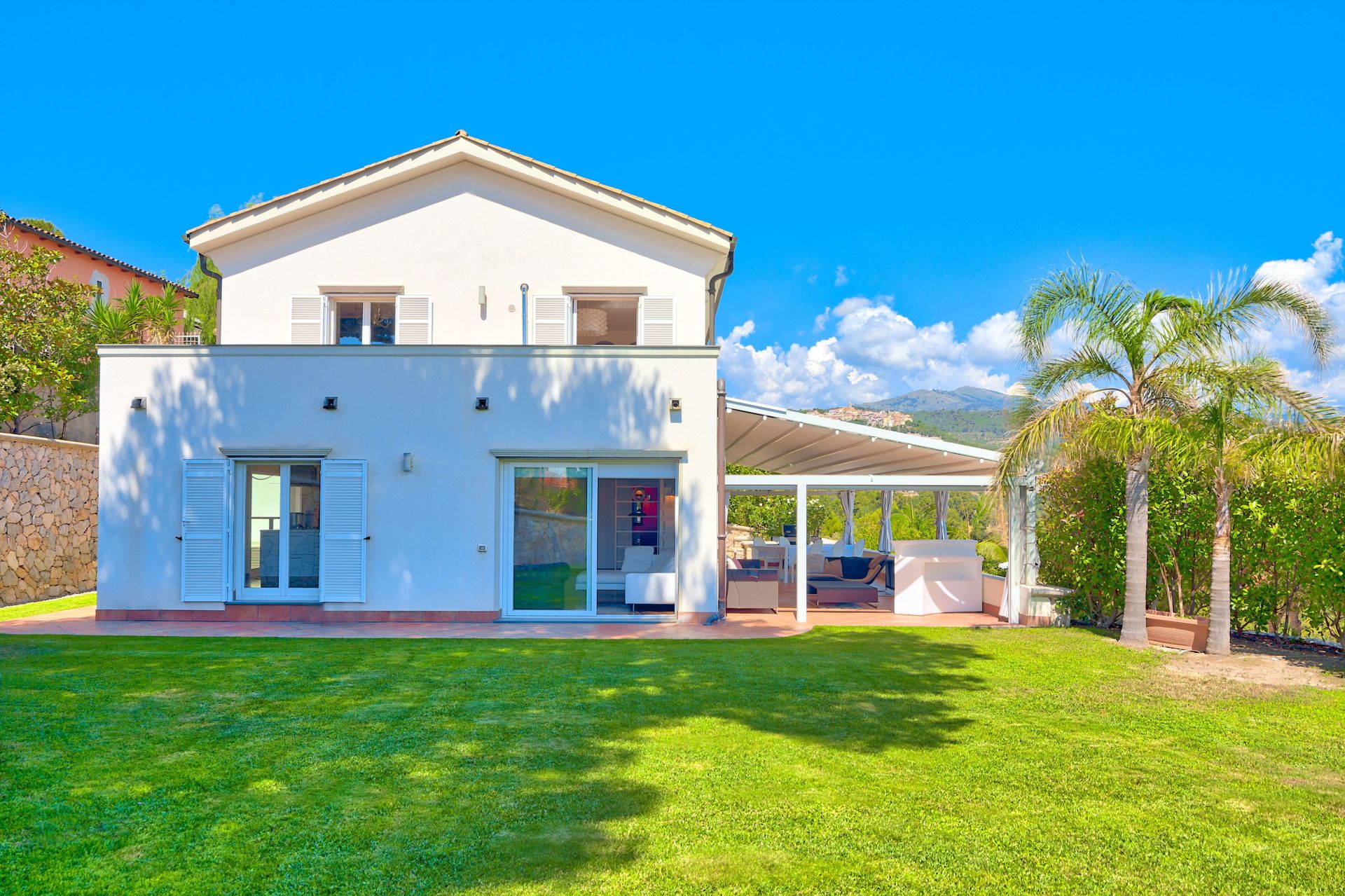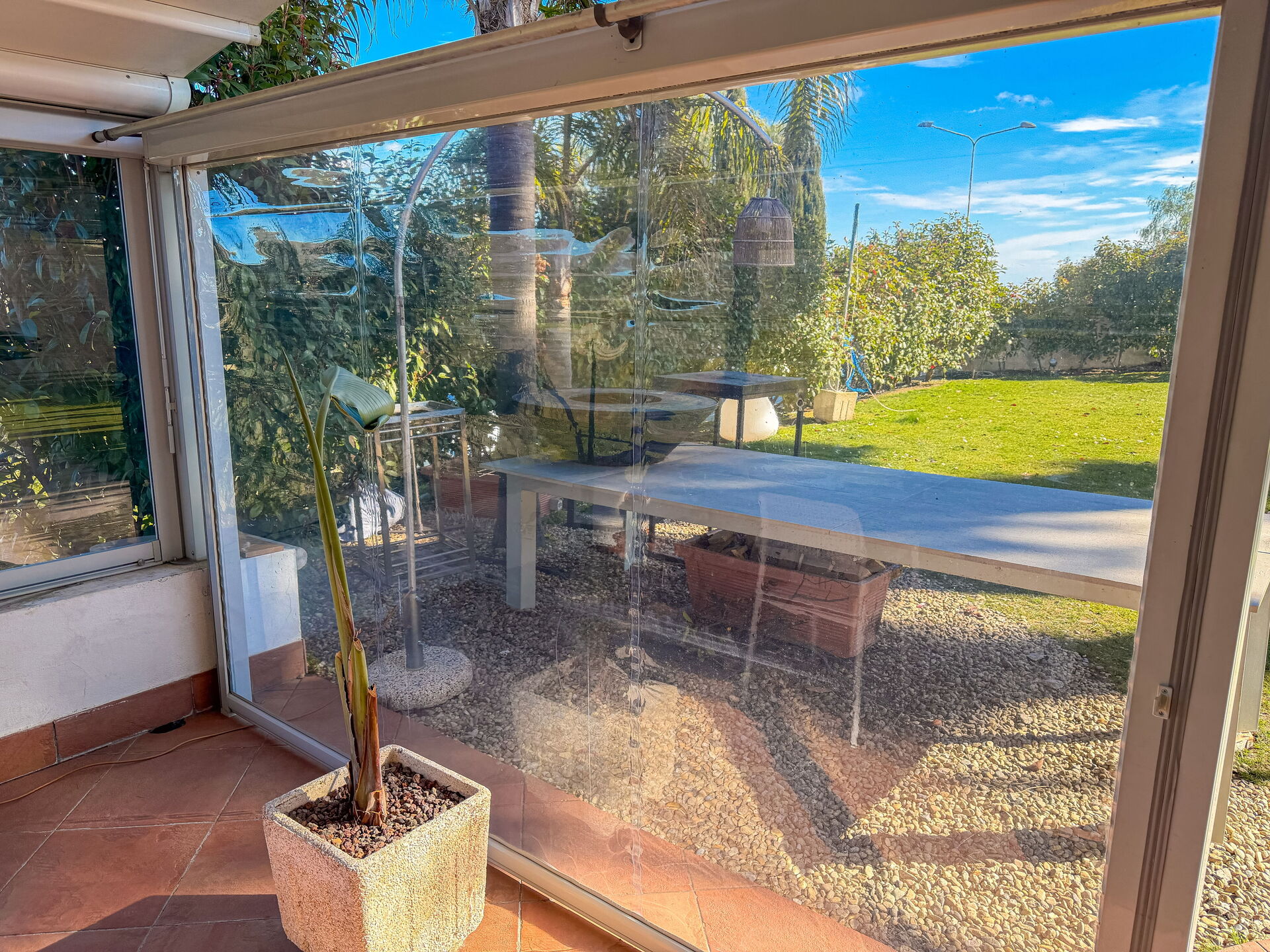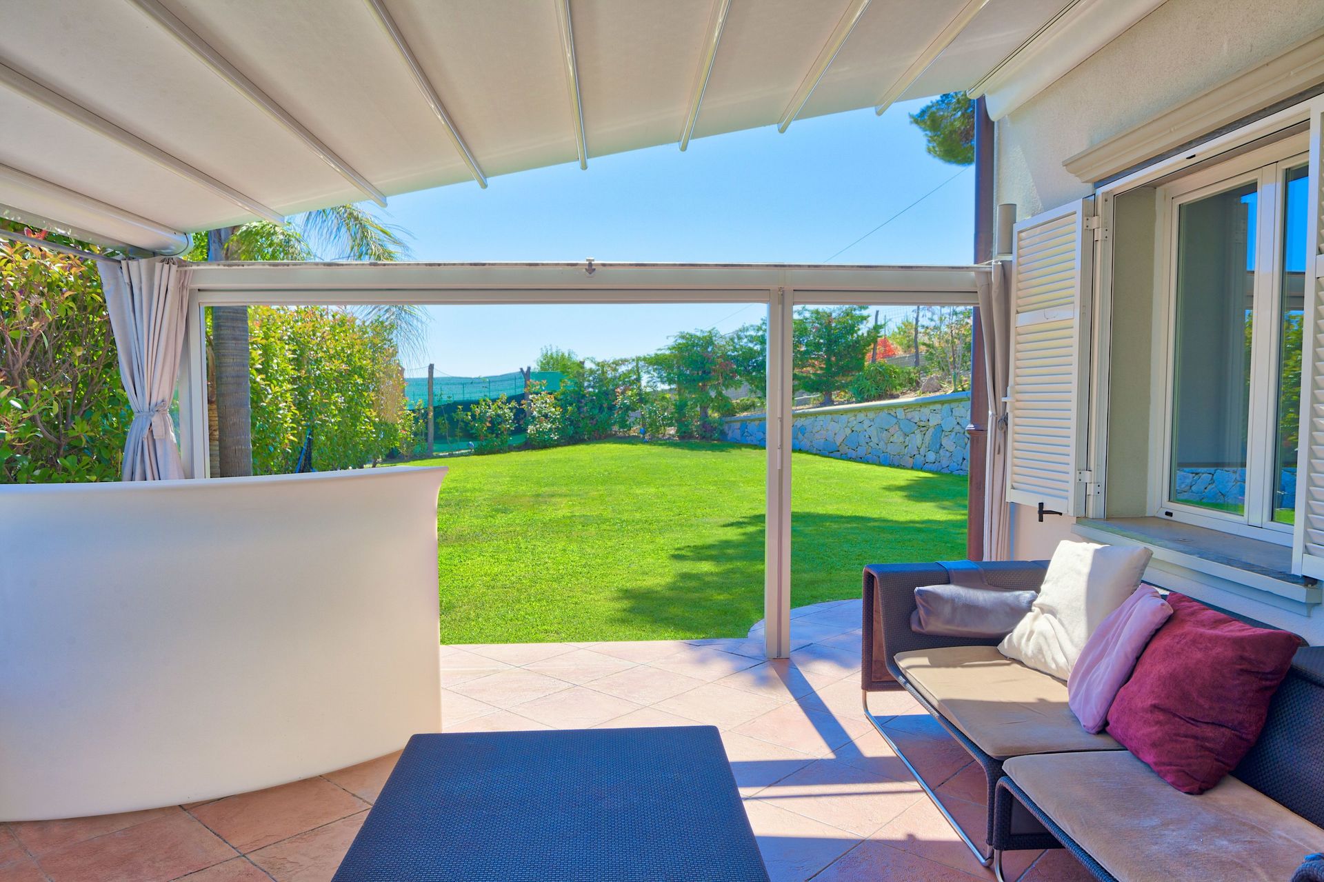 Mooie tuin met gazons, palm- en olijfbomen. Wekelijks onderhoud door een tuinman.