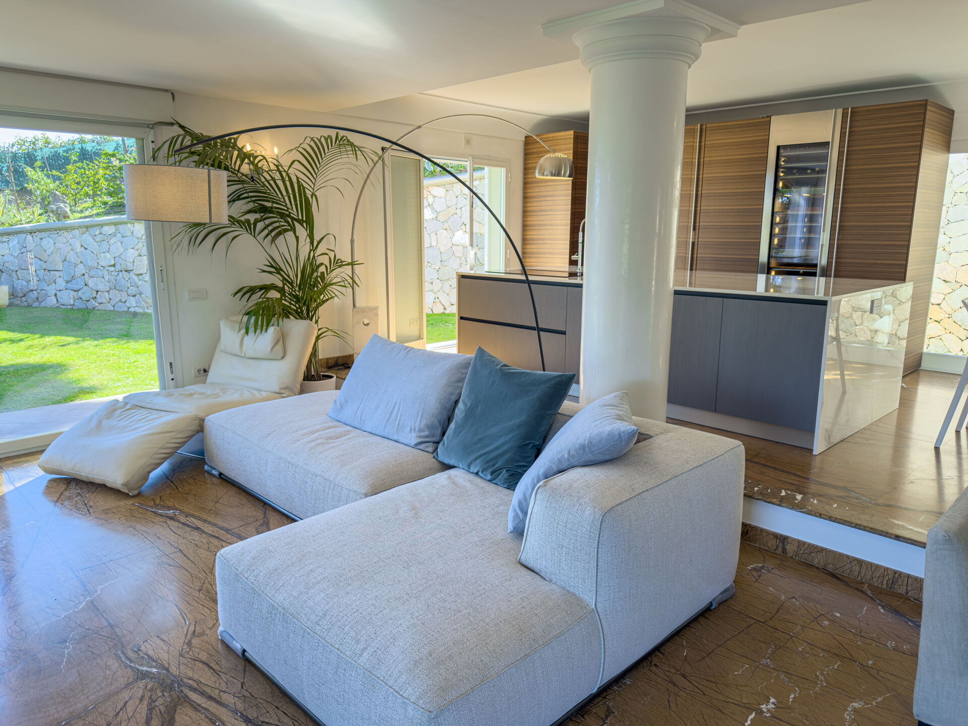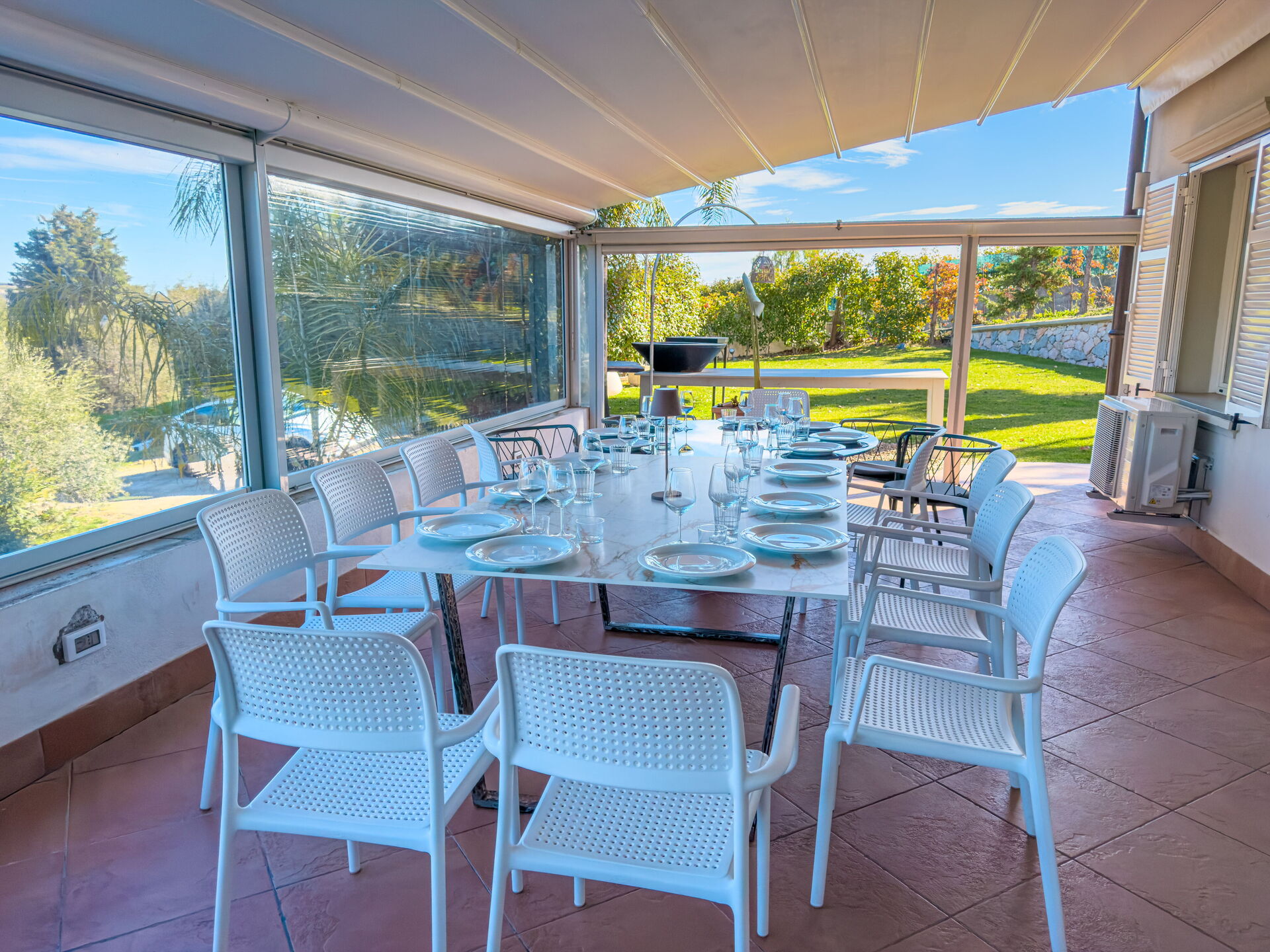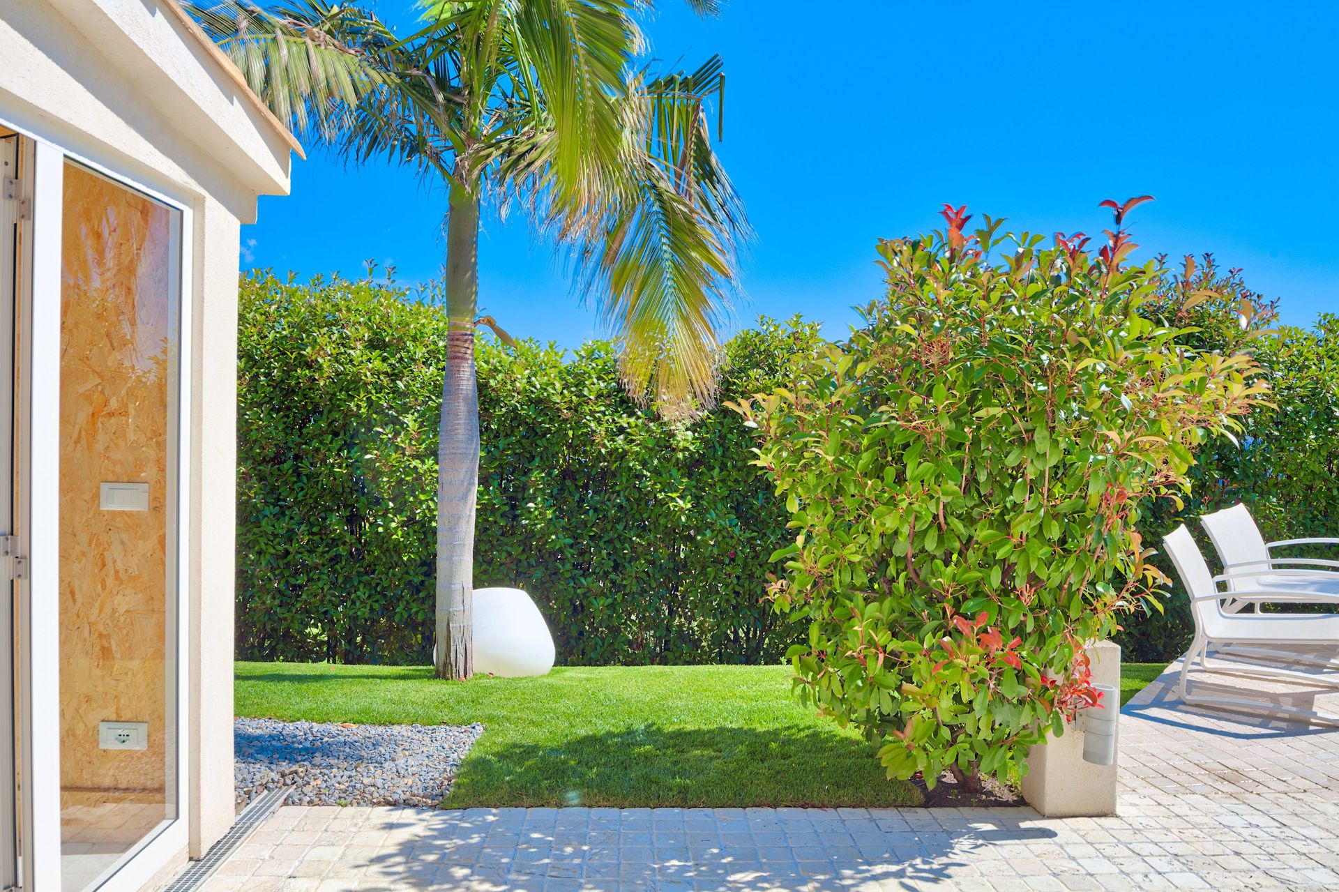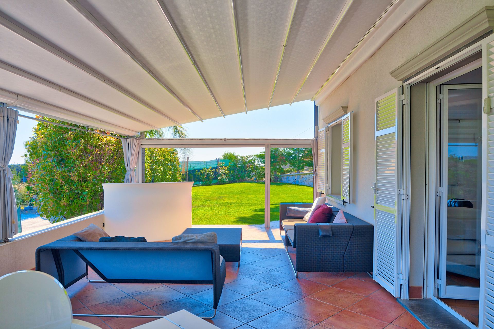 Mooie tuin met gazons, palm- en olijfbomen. Wekelijks onderhoud door een tuinman.