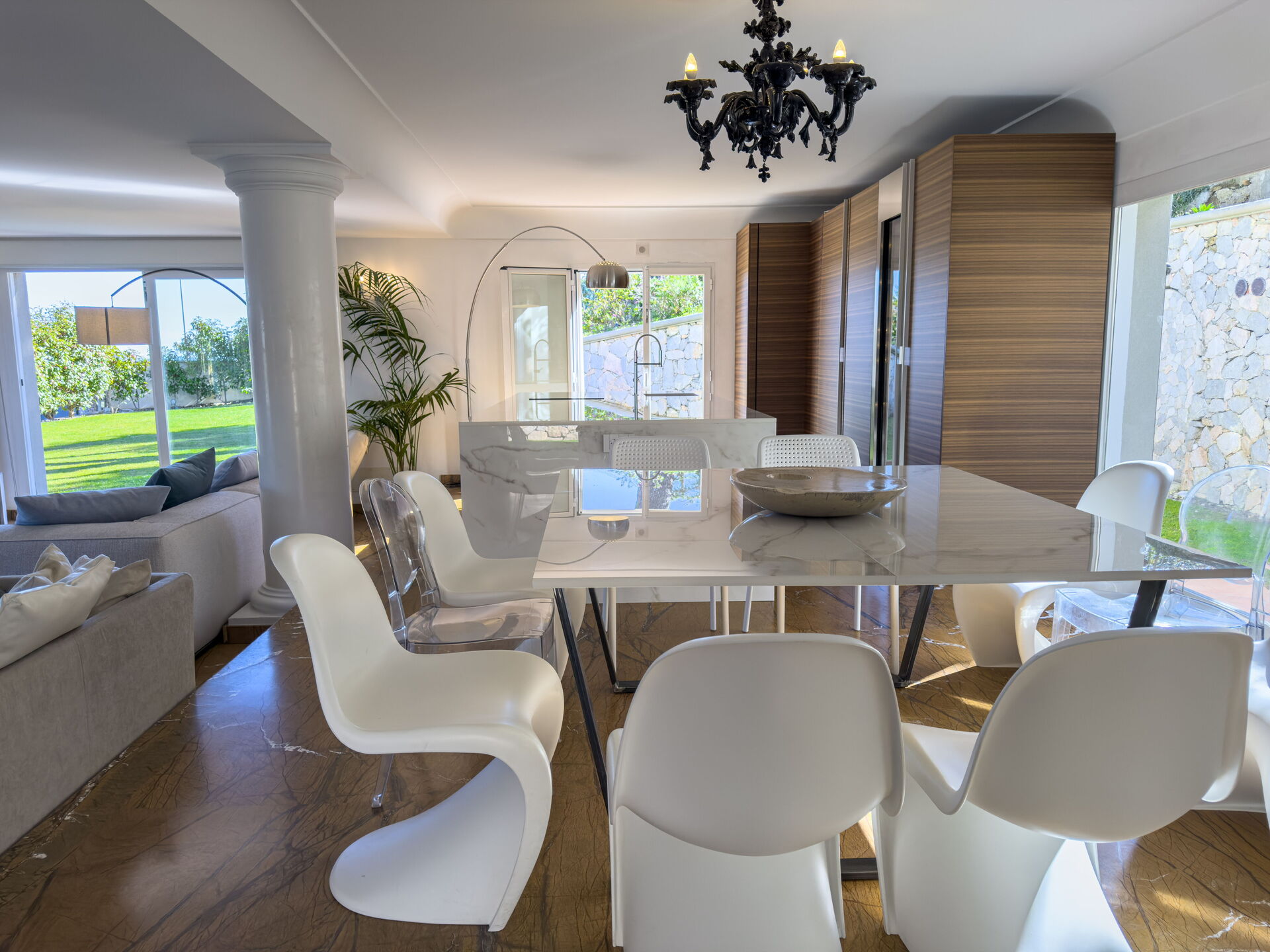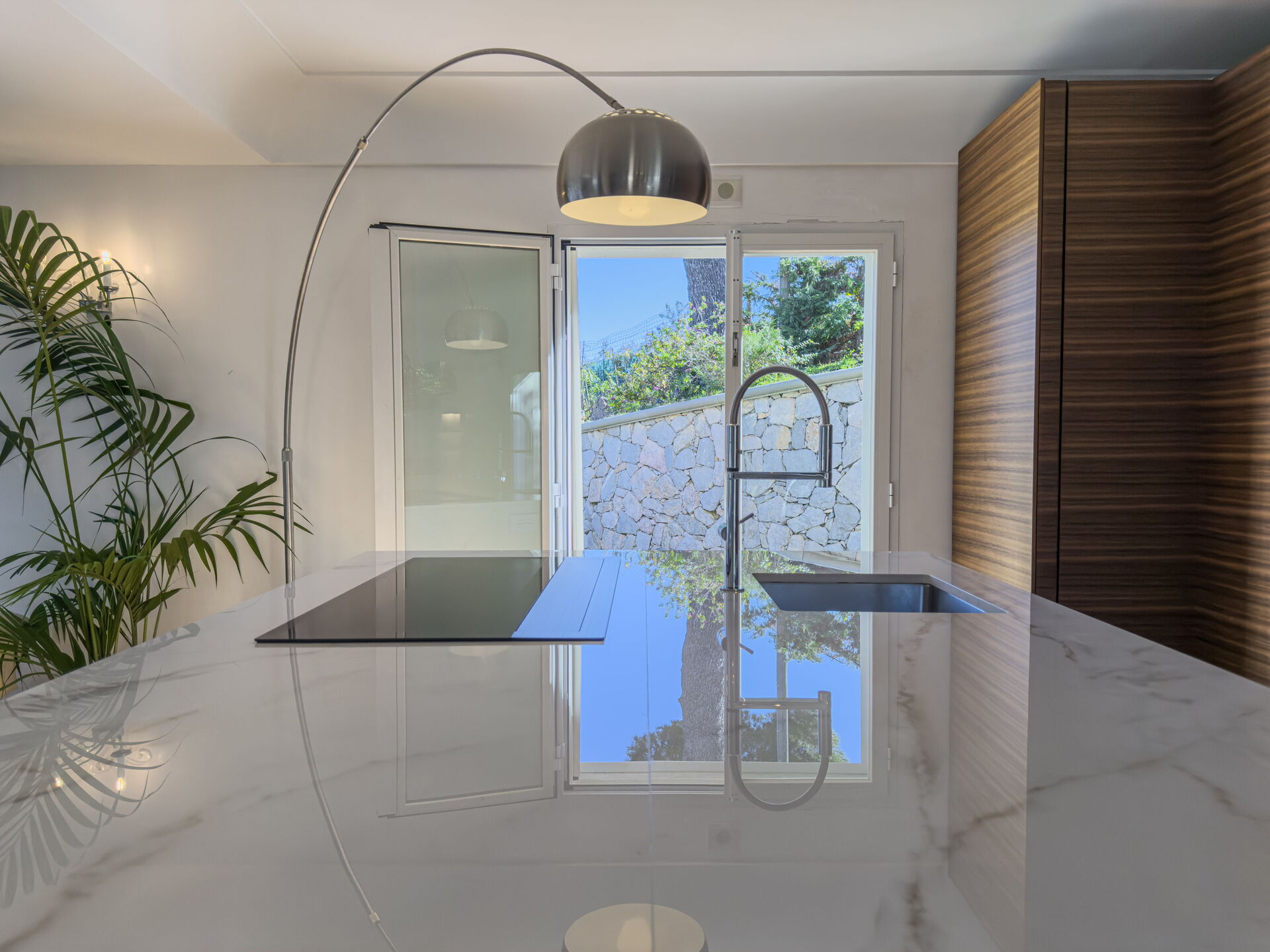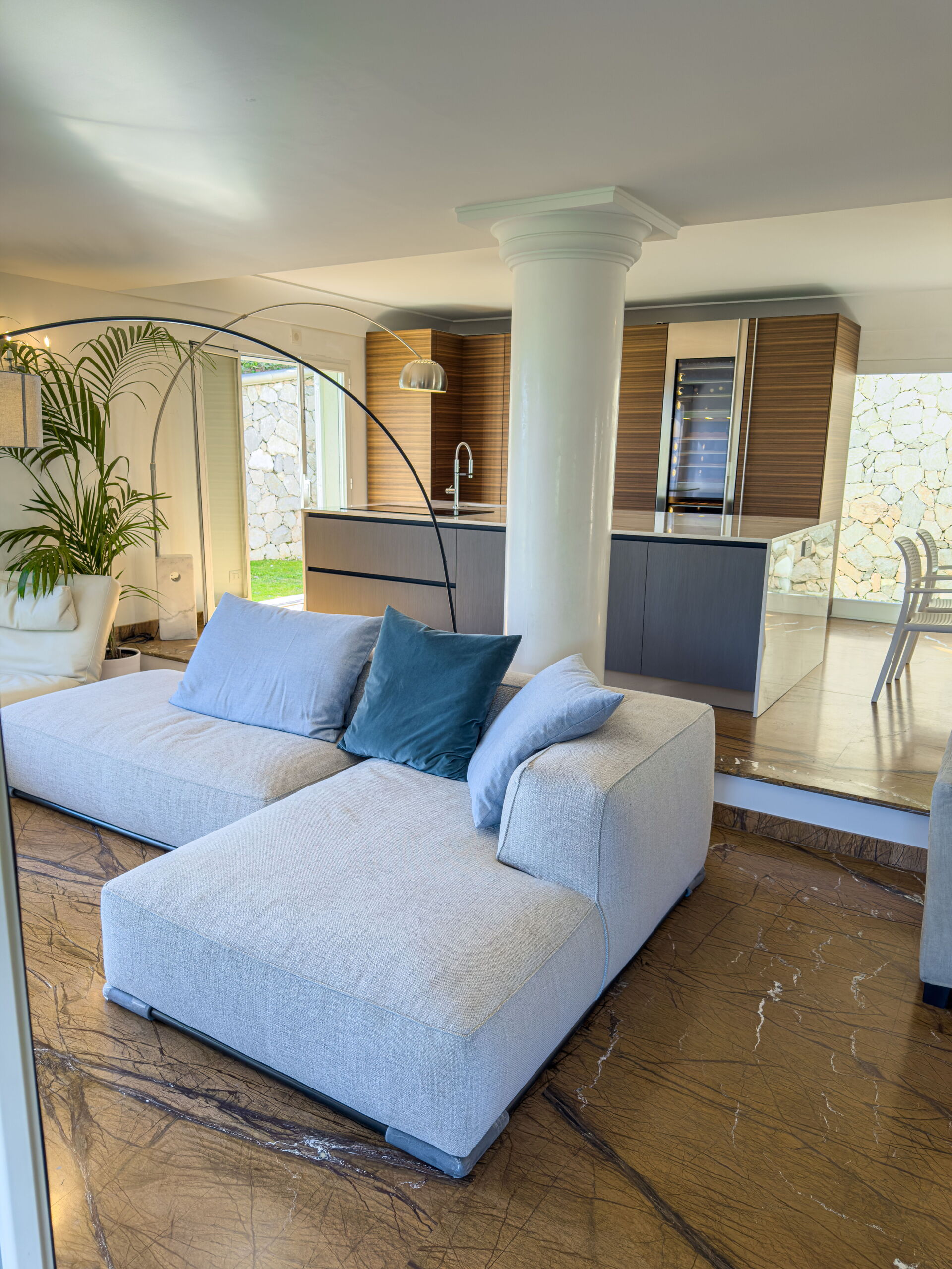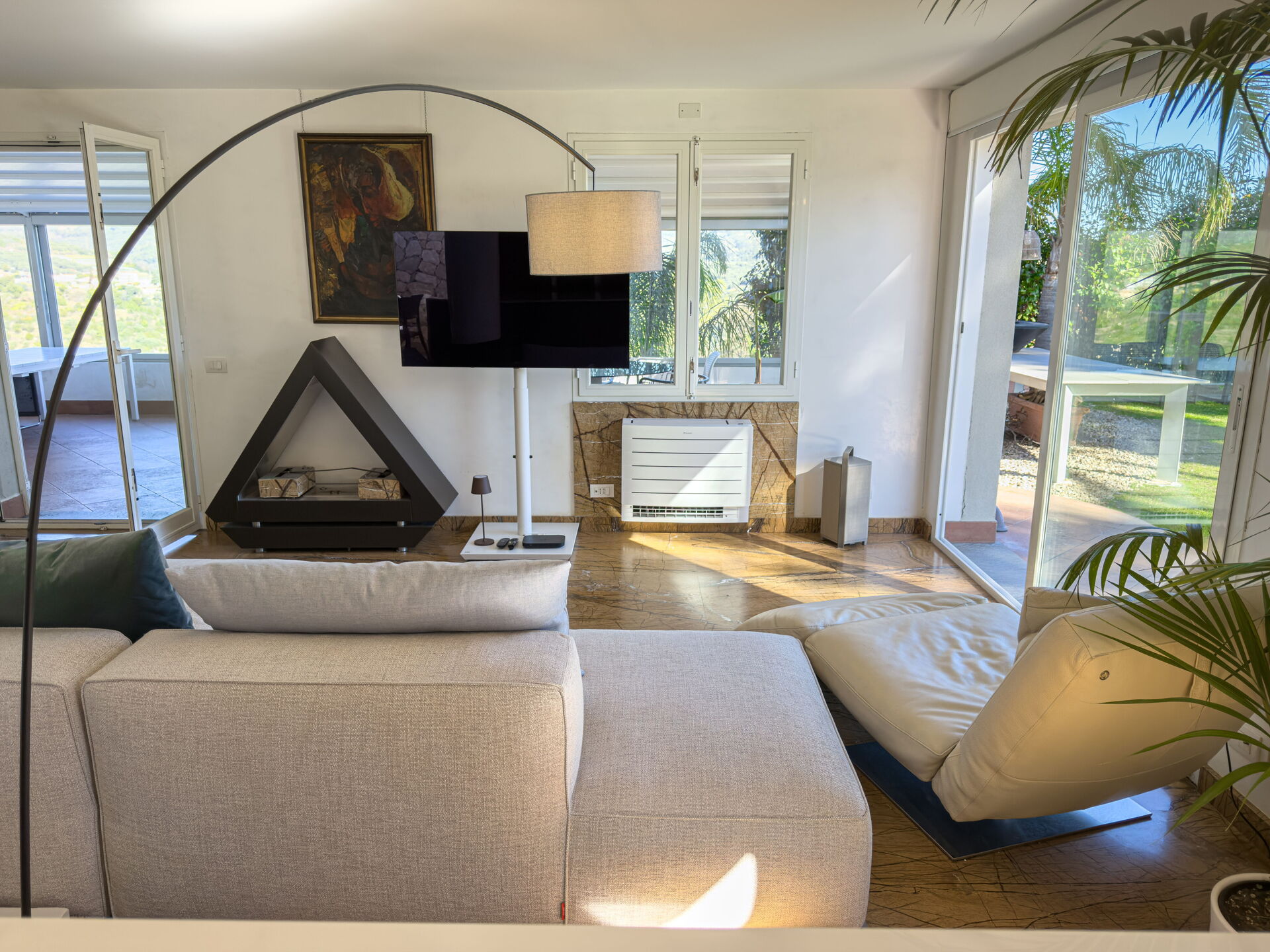 Mooie tuin met gazons, palm- en olijfbomen. Wekelijks onderhoud door een tuinman.