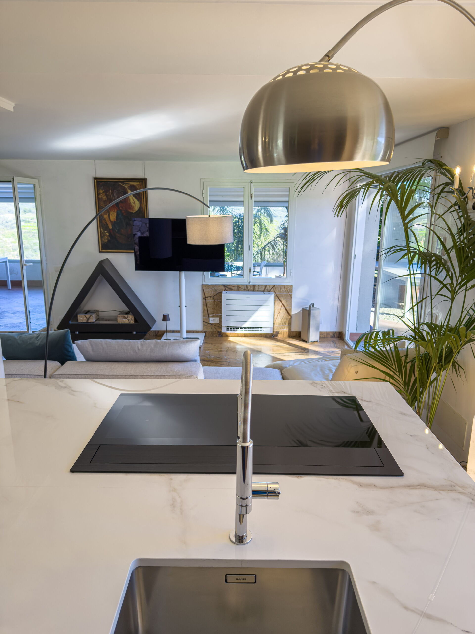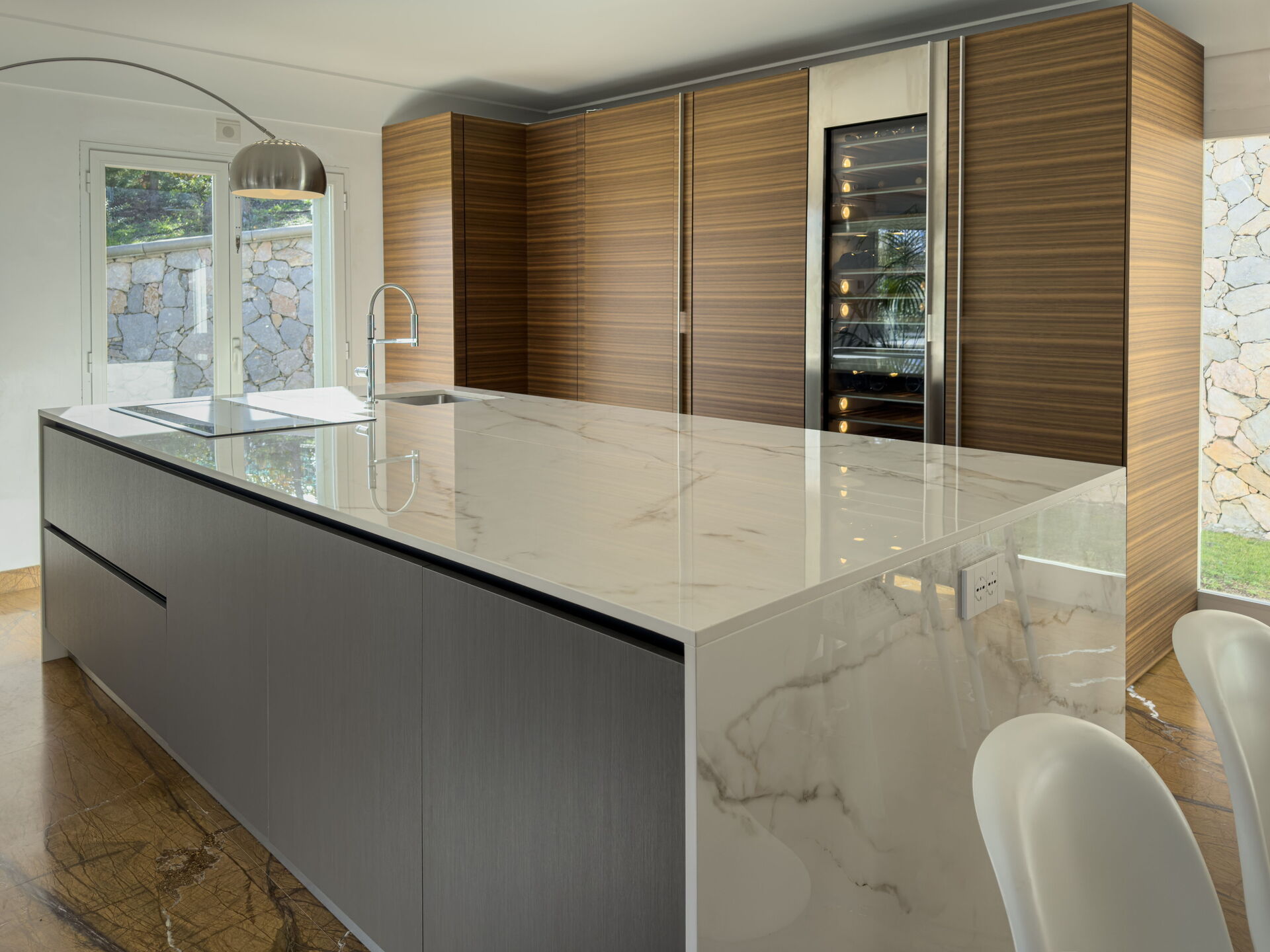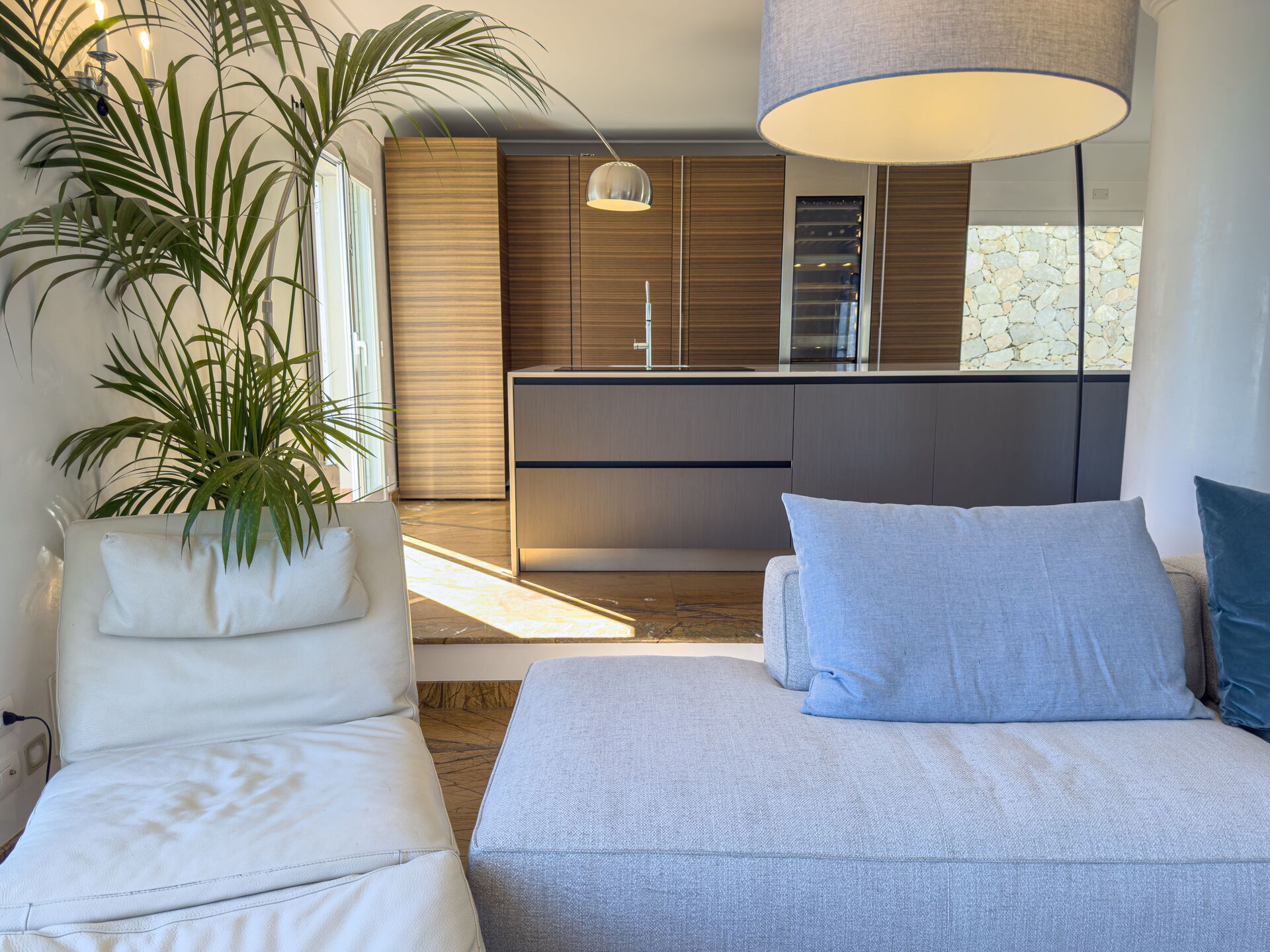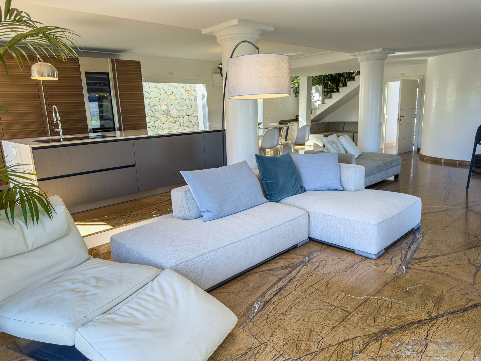 de gehele eerste verdieping bestaat uit een woonkamer en keukeneiland, een grote open ruimte.