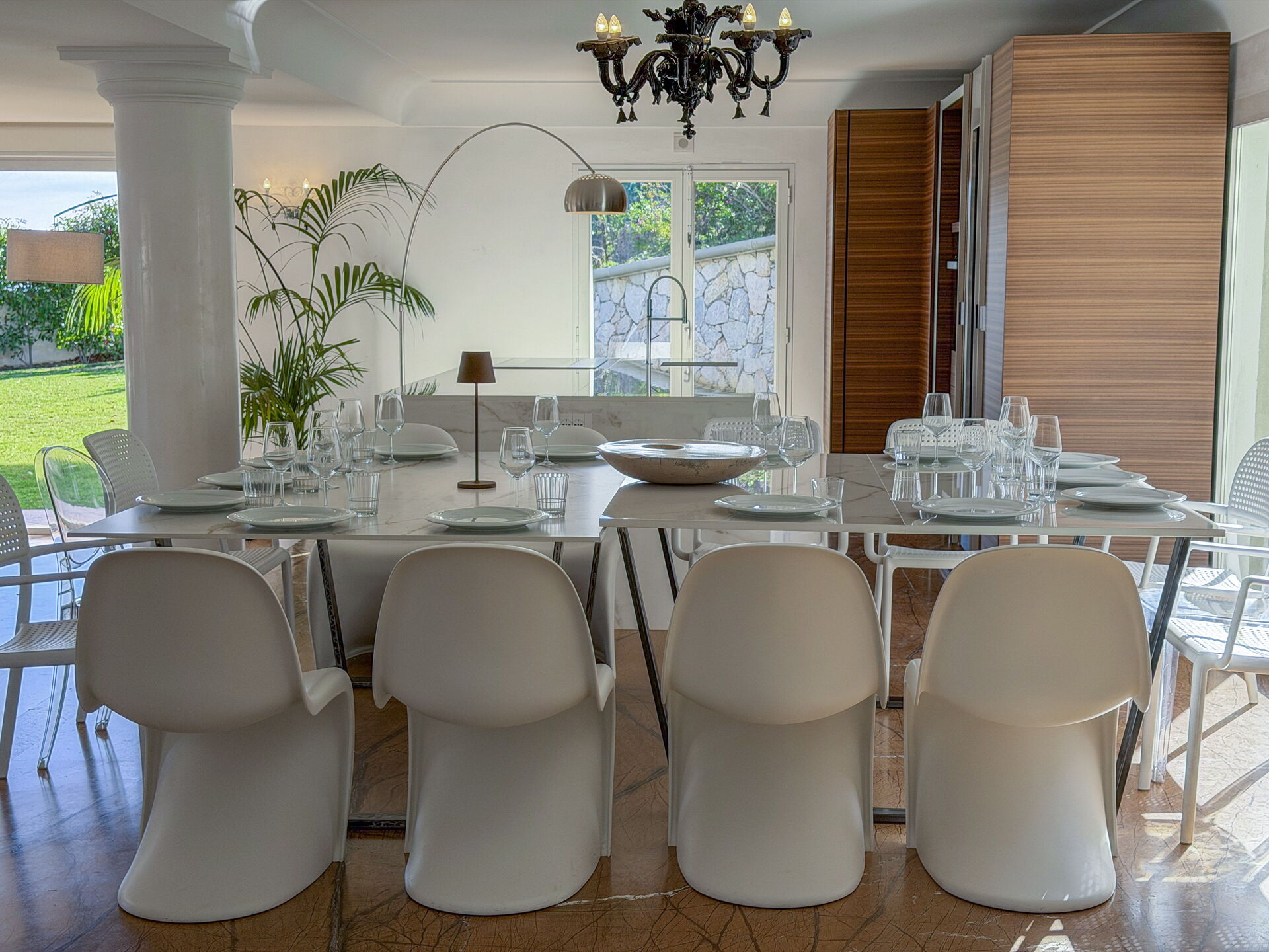 Eettafels en stoelen.