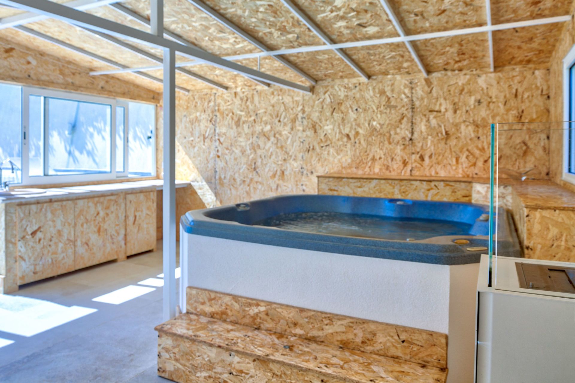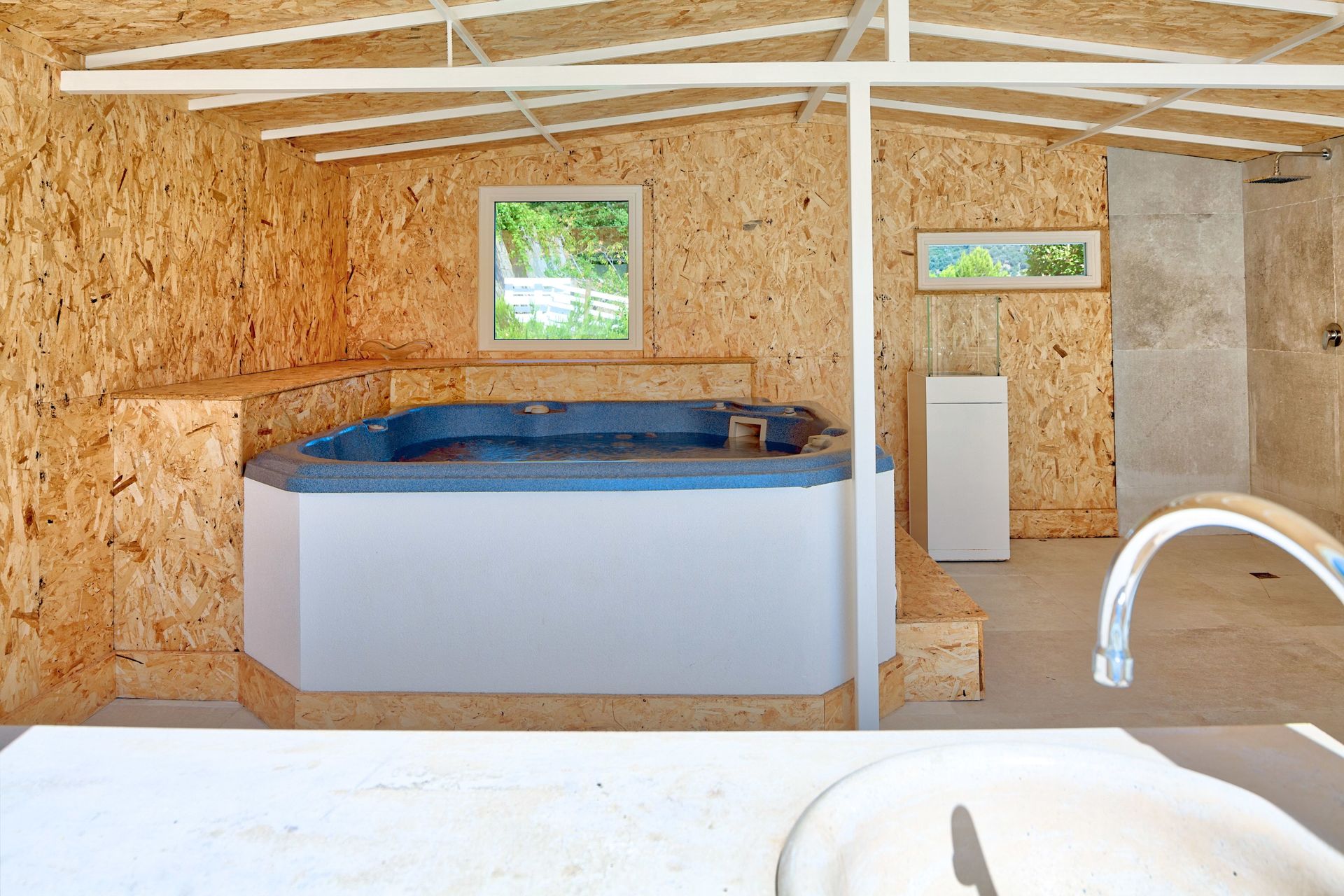 HOT-TUB in het houten huis, naast het zwembad: