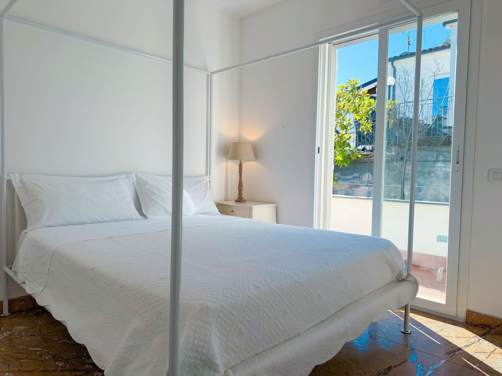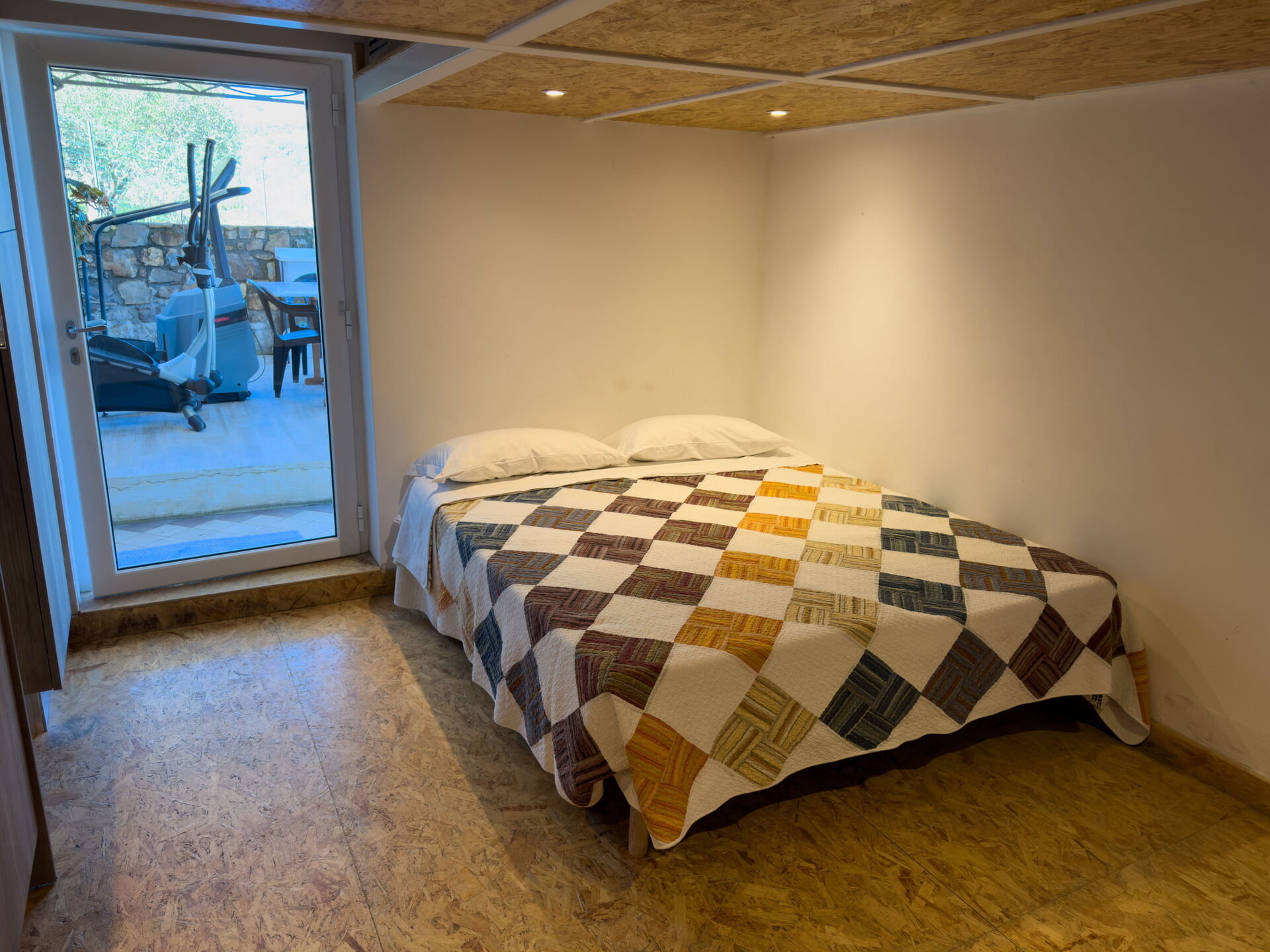 De vierde slaapkamer op de begane grond heeft een aparte toegang vanuit de tuin: er is geen interne verbinding met de andere drie slaapkamers.