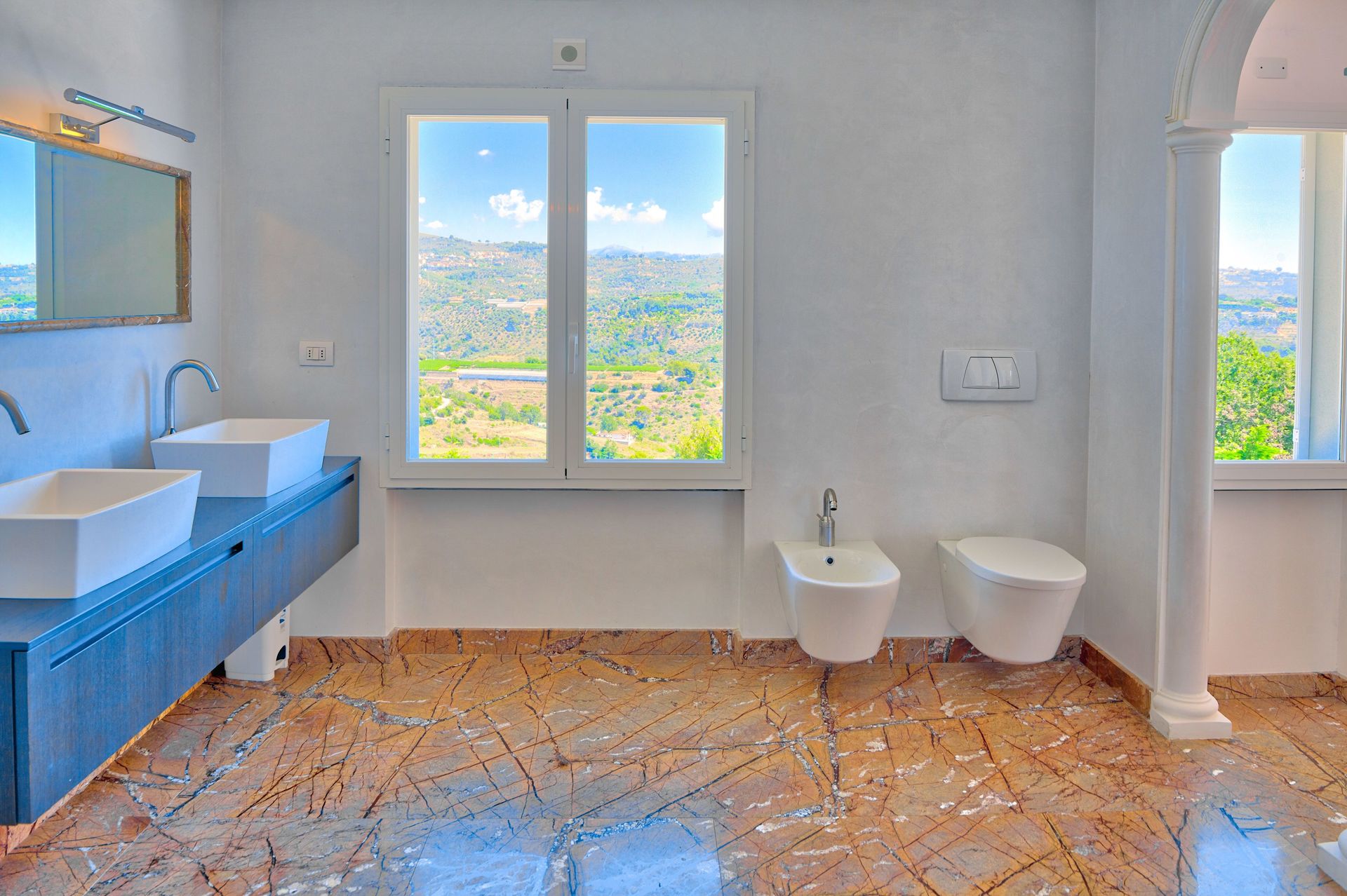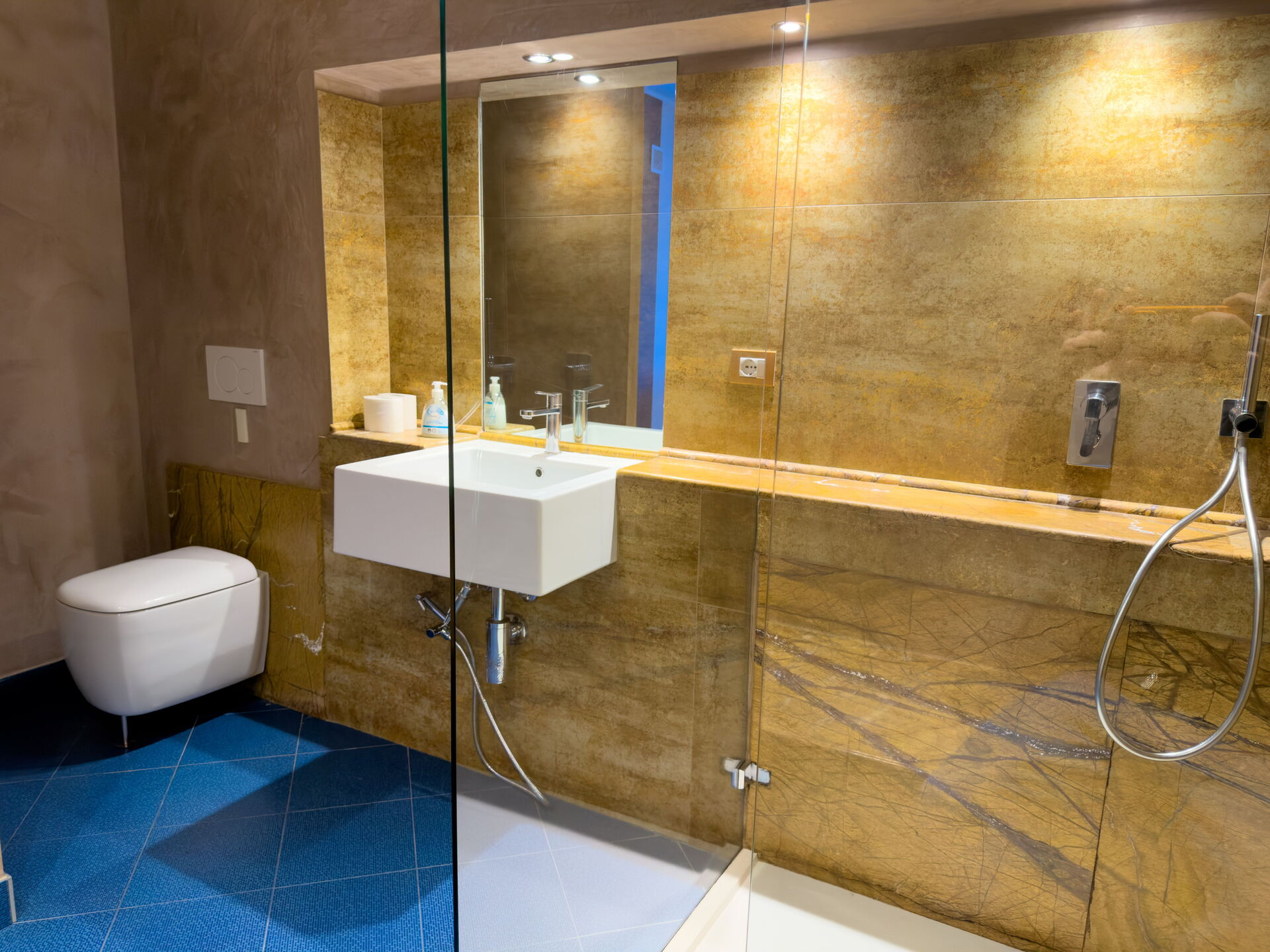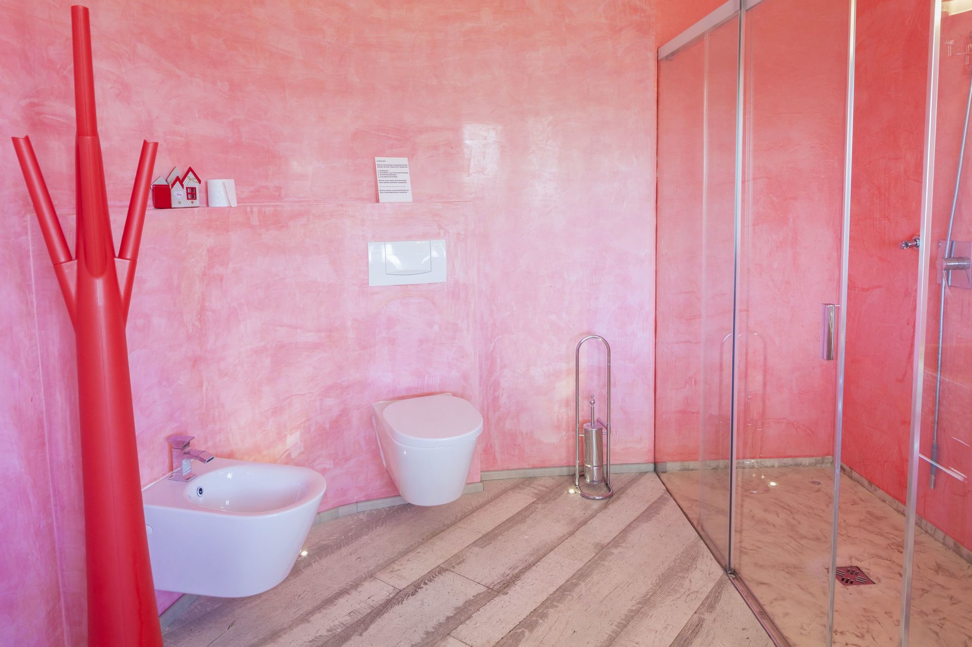 Badkamer met douche voor twee personen, toilet, bidet, wastafel.