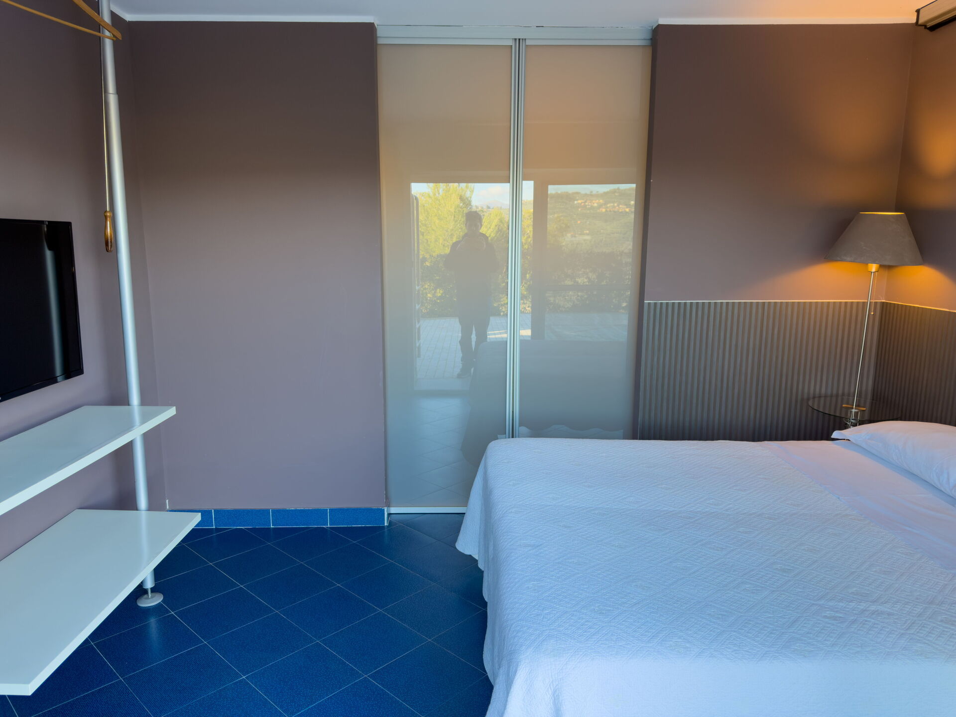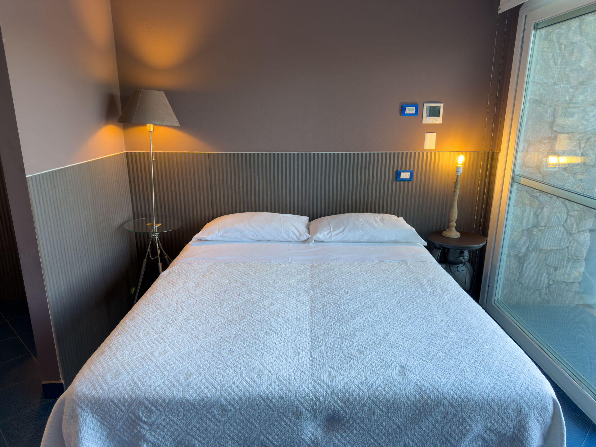 Deur en gang die naar de eerste slaapkamer leiden, met een hemelbed, satelliet-tv, wastafel, koelkast en magnetron, alleen voor eenvoudige maaltijden. (Naast het bassin bevindt zich achter een deur een kleine wasruimte met wasmachine, droger, strijkijzer en strijkplank.)