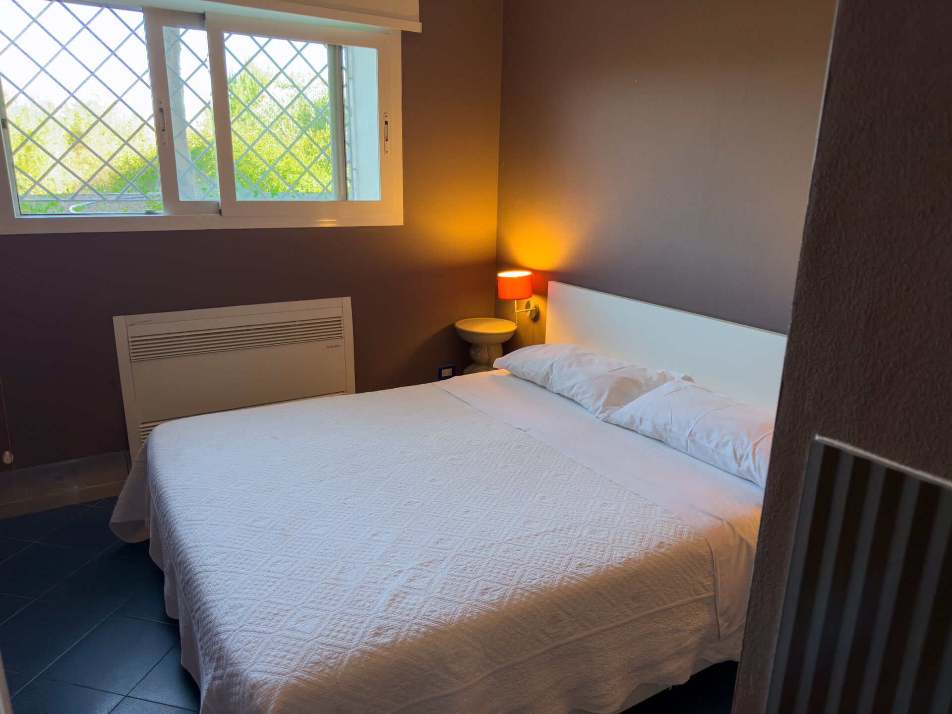 De tweede slaapkamer met een tweepersoonsbed, met satelliet-tv, is gescheiden van de eerste slaapkamer door een glazen schuifdeur. De tweede slaapkamer heeft directe toegang / uitgang van / naar de tuin.