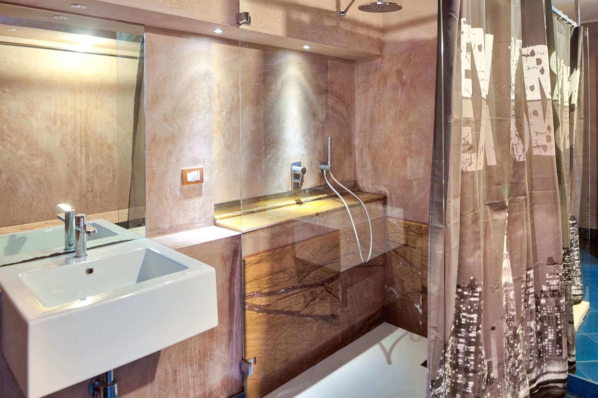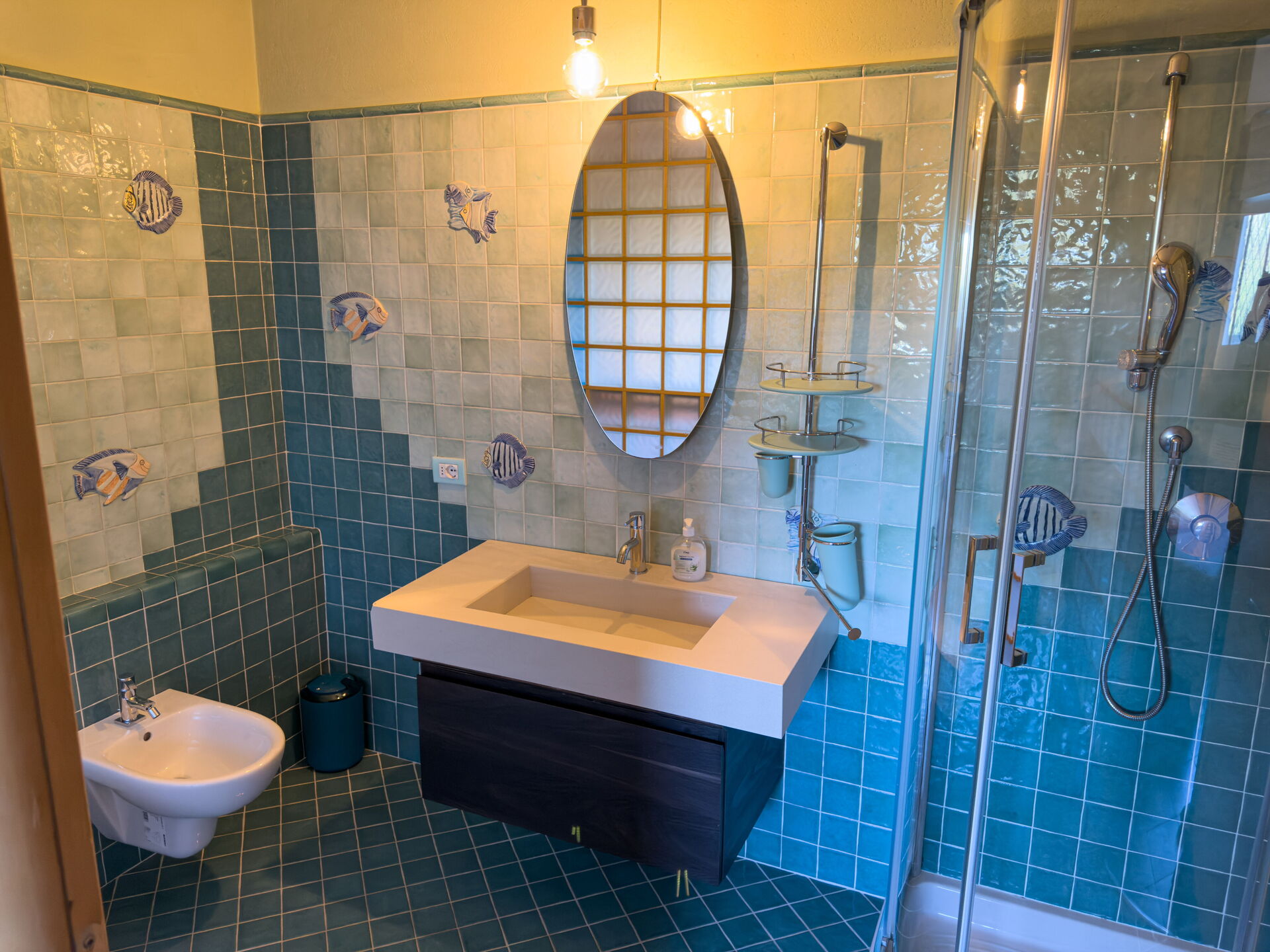 Badkamer met douche, wastafel, toilet, bidet.