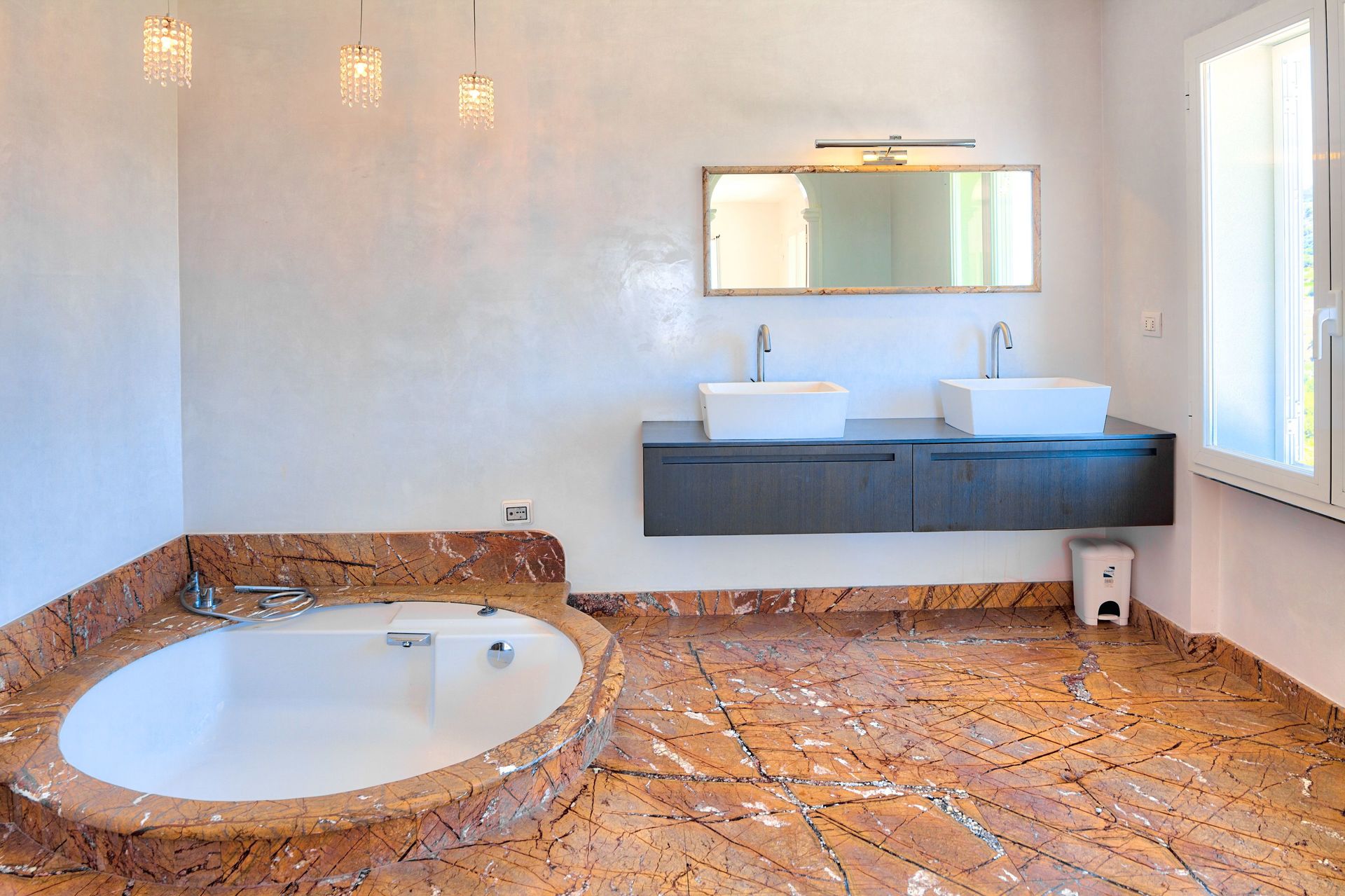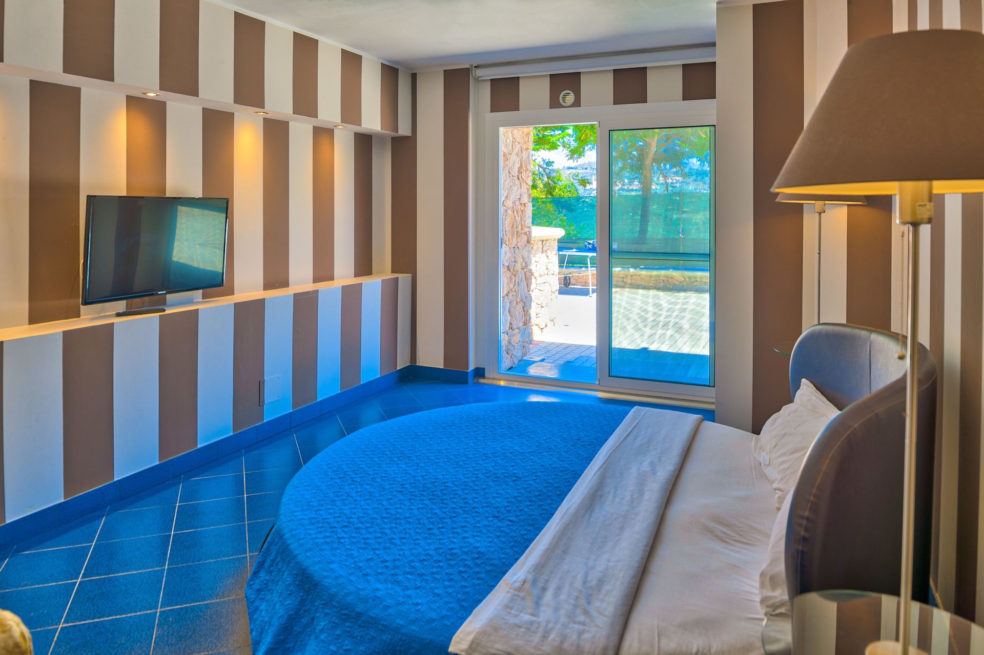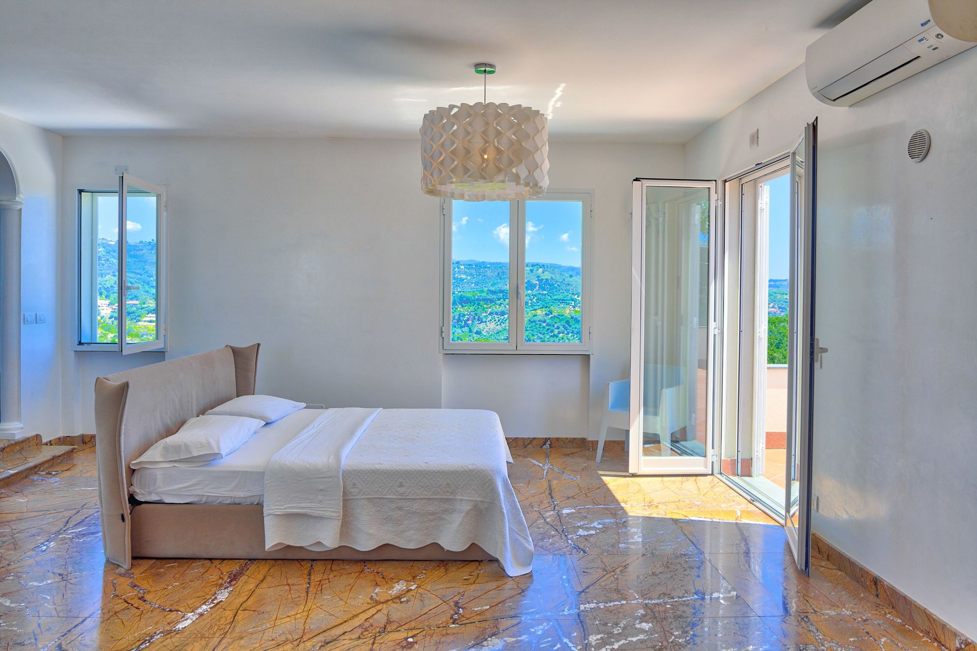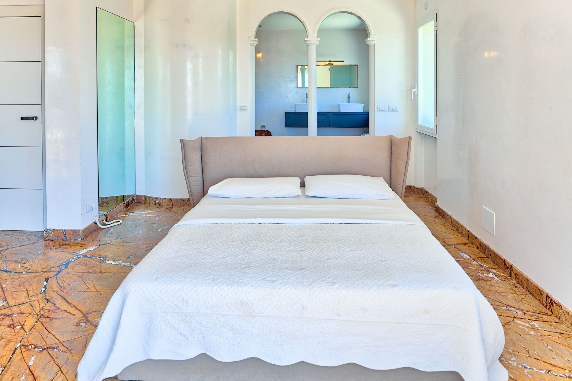 Een slaapkamer met eigen badkamer: tweepersoonsbed, airconditioning, directe toegang tot terras met zeezicht, satelliet-tv, walk-in closet. Eigen badkamer met badkuip, douche, dubbele wastafel, toilet, bidet.