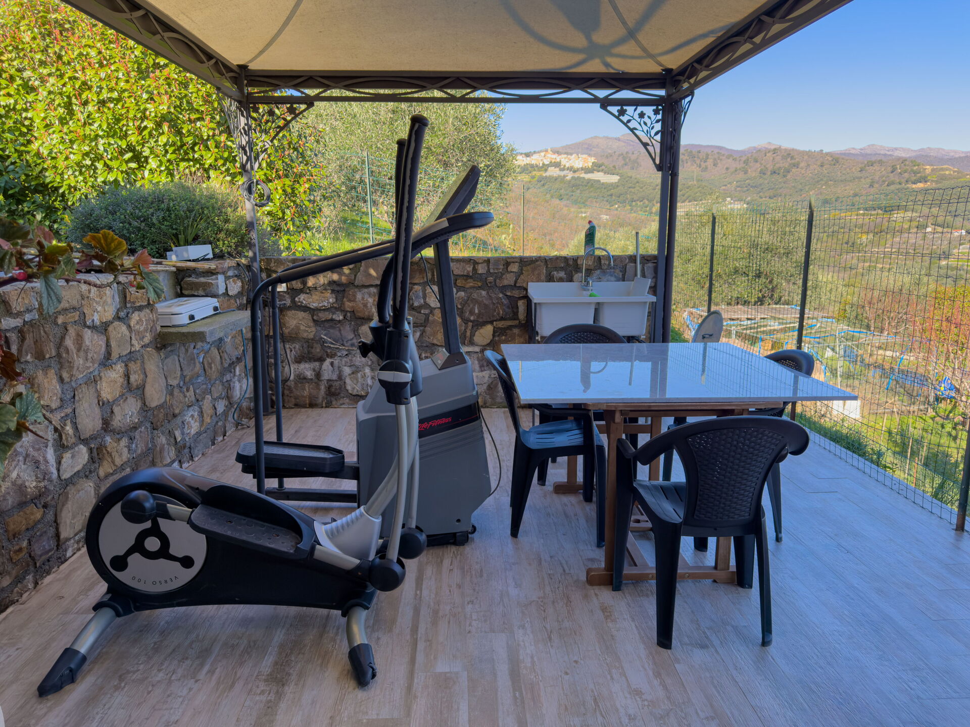 Tuinmeubelen, ligstoelen en parasols. Tennis tafel.
