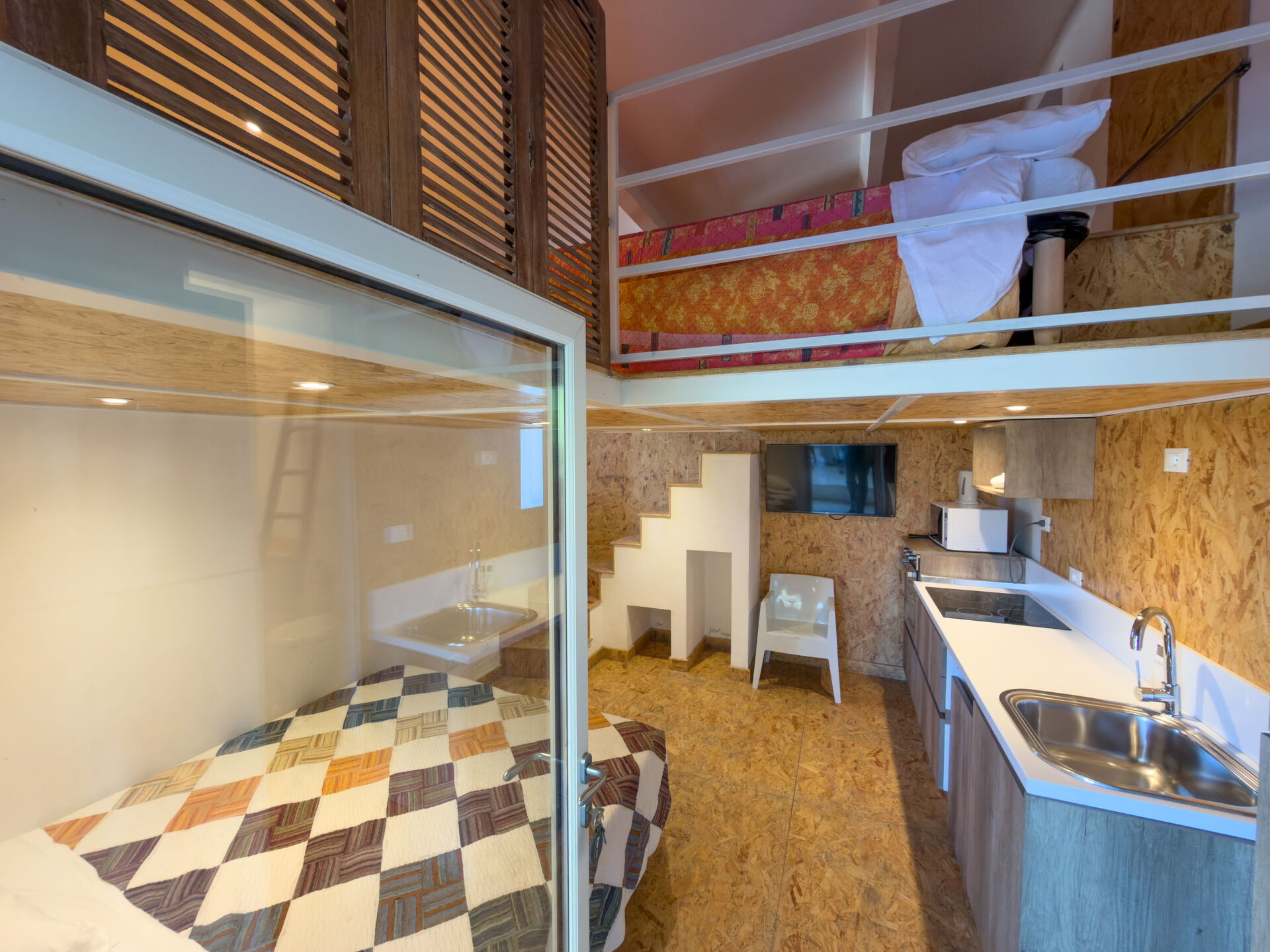 Het is een klein houten bijgebouw, met ingerichte keuken en badkamer op de begane grond.