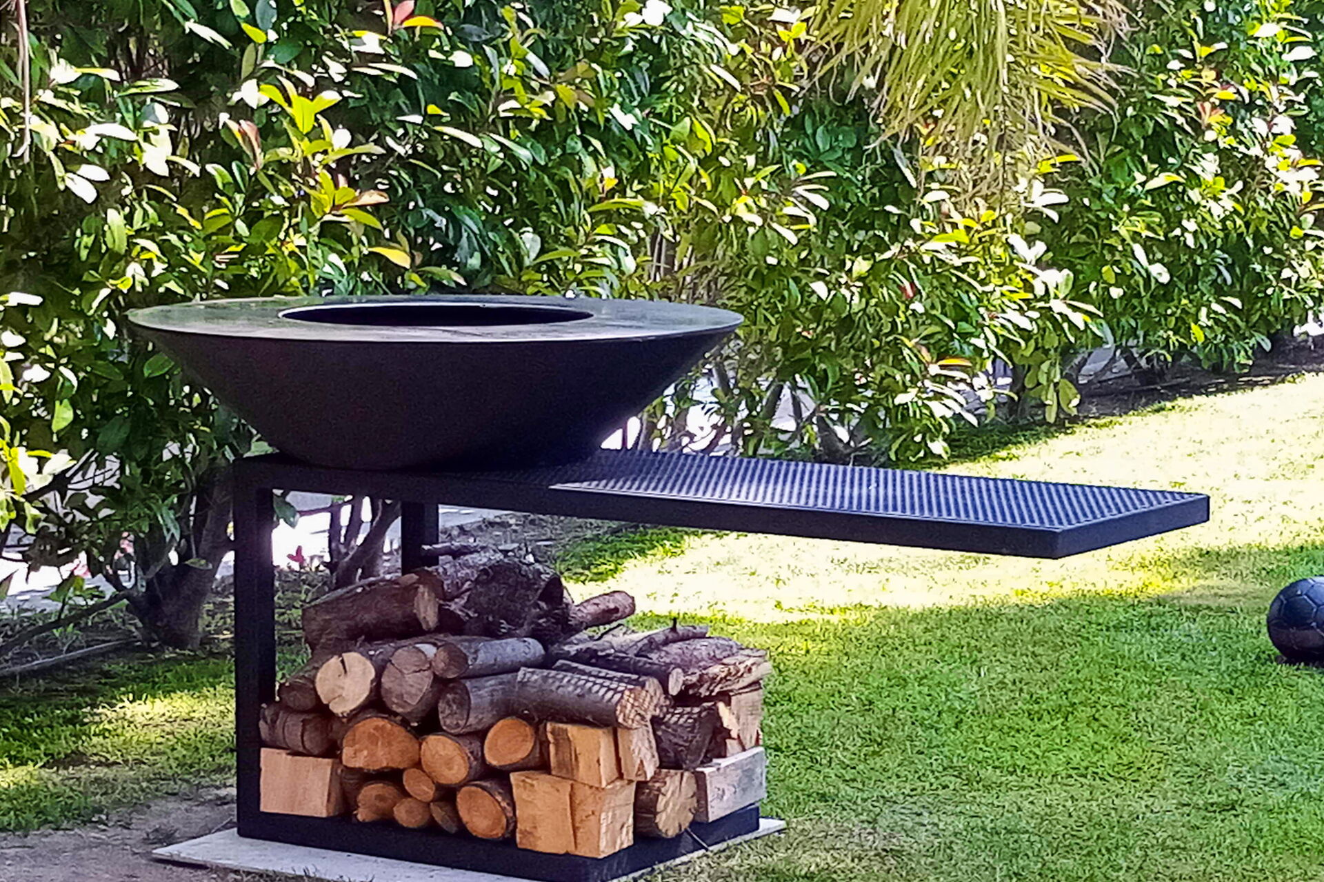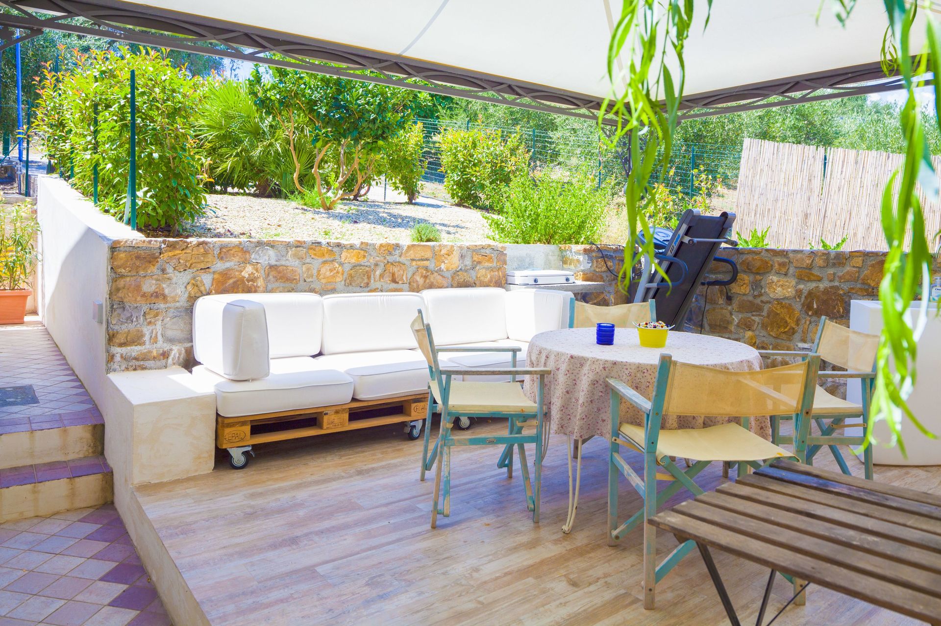 Aan de voorzijde van het bijgebouw is er een terras met tafel, stoelen, bank, grill.