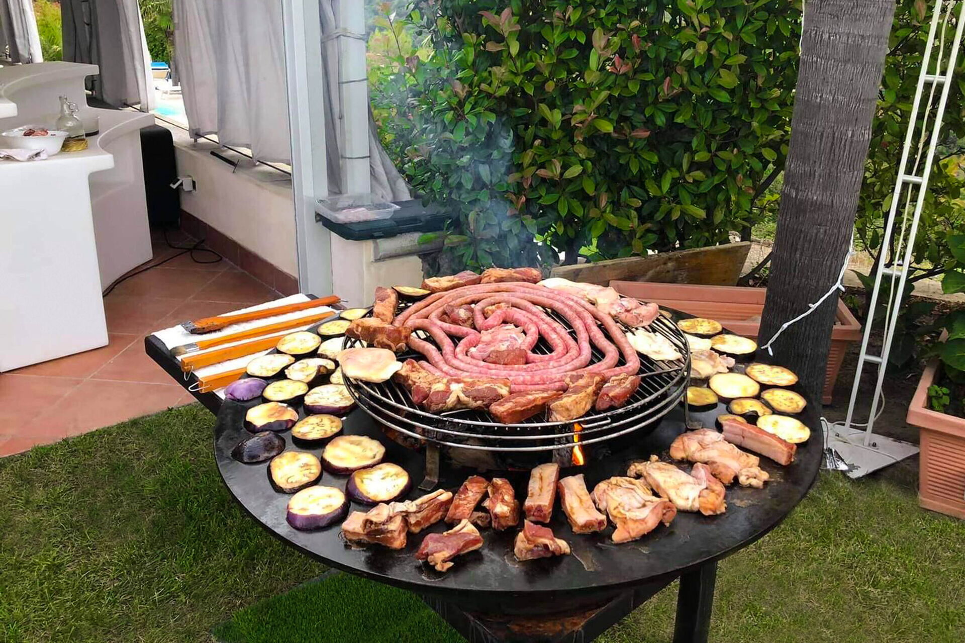 Buiten het bijgebouw is er een patio om 'al fresco' te dineren, met grill, tafel, stoelen, bank.
