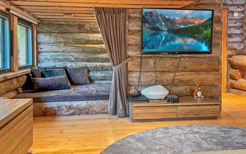 27 km to the north from Kuusamo, Vuosseli (East-Ruka) 800 m. Rustic log cabin built in 1990, renovated in 2012. Bedroom 1 (ground floor): double bed, bedroom 2 (ground floor): 2 beds. Bedrooms 3-5 (upper floor): 2 beds. 2 mattresses (upper floor). 2 toilets, one upstairs. Kitchen, dining room, electric sauna. Villa Valtavaara is a luxurious rustic log cabin located in Saarua-aho area in Ruka. Beautifully decorated and well-equipped villa is located next to the ski slopes and ski trails. Nature conservation area of Valtavaara with snowshoeing and hiking trails starts behind the cabin. Beautiful views to the ski slopes, lakes and forest.