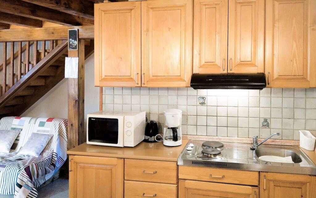 Keukentje: in de woonruimte. Keuken apparatuur en gerei: 2 kookplaten, magnetron, koel-/ vriescombinatie, koffie-apparaat, waterkoker, broodroster.