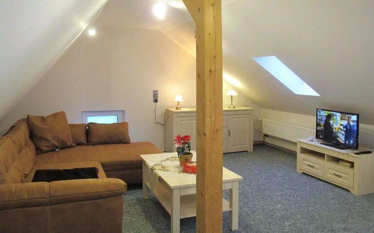 Woon-/ slaapruimte 2(bovenverdieping 1, schuin dak): zithoek, tweepersoonsslaapbank. Van woonruimte trap direct in de slaapkamer nr. 1.