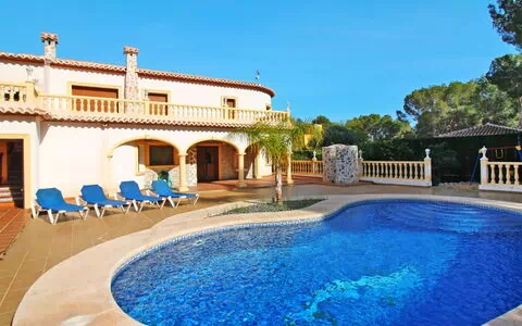 Huis "Bahia de Moraira". 3 km van het centrum van Moraira, 8.5 km van het centrum van Calpe, 80 km van het centrum van Alicante, in een woonwijk, 1.5 km van zee. Voor alleengebruik: terrein 600 m2 (omheind) met bomen, openluchtzwembad (10 x 5 m, 01.01.-31.12.). Buitendouche, prieel, parkeerplaats (voor 4 auto's) op het terrein. Winkel 300 m, zandstrand "Moraira" 2.5 km, rotsstrand "Cala Baladrar" 1.5 km. Let op: Eerste verdieping is afgesloten en niet bewoond.