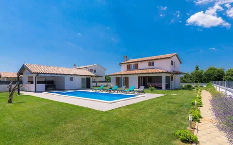 Šišan 4 km van Medulin: Mooi villa "Alba", van 2 verdiepingen, bouwjaar 2019. 900 m van het centrum van Šišan, 8 km van het centrum van Pula, rustige, zonnige ligging, 2 km van zee, 2 km van het strand. Voor alleengebruik: terrein 2.000 m2 (omheind), mooie tuin met gazon en planten, 2 zwembaden hoekig (10 x 5 m, 140 cm diepte, seizoensgebonden beschikbaarheid: 04.Apr. - 24.Okt.) met trap. WC bij het zwembad, buitendouche, poolhouse met douche, tafeltennis, tuinmeubelen, barbecue, kinderspeelplaats (glijbaan, schommel). In het huis: internetaansluiting, hot tub, infrarood sauna, tafelvoetbal, trampoline, wasmachine. Toegangsweg tot aan het huis (300 m onverharde weg). Overdekte parkeerplaats (voor 4 auto's) bij het huis op het terrein. Winkel 800 m, supermarkt 6 km, restaurant 650 m, bushalte 600 m, kiezelstrand 2 km, rotsstrand 2 km. Surfschool 4 km, zeilschool 4 km, tennis 6 km, manege 1 km, wandelroutes 100 m vanaf het huis, fietspad 150 m. Het gebouw bestaat uit 2 huizen, welke als een eenheid worden verhuurd. Zwembad met hydromassage.
