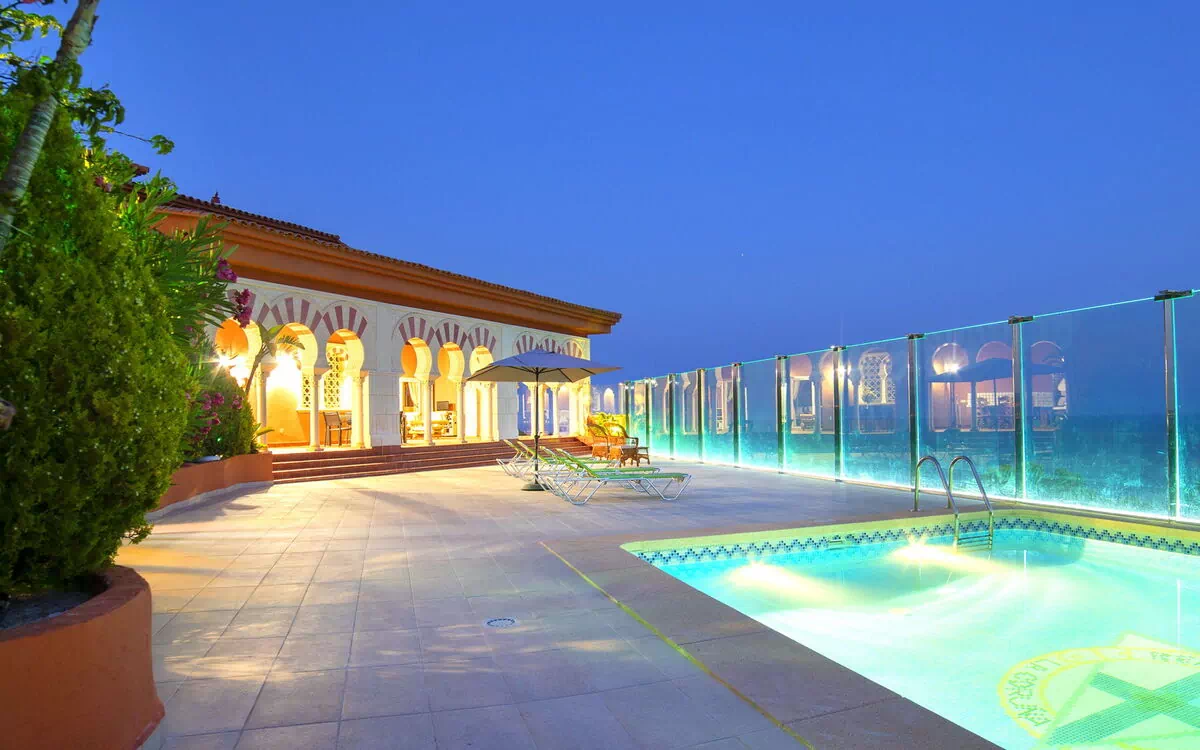 "Azahara", villa 5-kamers 307 m2. Ruim, mooi en stijlvol ingericht: groot woon-/eetkamer met Sat-TV en Digitale TV. Uitgang naar het terras, naar het zwembad. 1 kamer met Kleedkamer met 1 2-pers bed (1 x 150 cm, lengte 190 cm), bad/WC, air-conditioning en heteluchtverwarming. 1 kamer met 2 bedden (90 cm, lengte 190 cm), bad/WC, dubbele wastafels, air-conditioning en heteluchtverwarming. 1 kamer met 2 bedden (90 cm, lengte 190 cm), bad/WC, air-conditioning en heteluchtverwarming. 1 kamer met 2 bedden (90 cm, lengte 190 cm), douche/WC, air-conditioning en heteluchtverwarming. Groot keuken (oven, afwasmachine, 4 keramische glas kookplaten, magnetron) met eettafel. Uitgang naar het terras. Aparte WC. Groot terras. Terrasmeubelen, barbecue, ligstoelen. Panoramazicht op zee, de plaats en het dorp. Ter beschikking: wasmachine, kinderstoel, kinderbed, haardroger. Internet (WiFi, gratis). Parkeerplaats. Geschikt voor families. VT-485094-A // Reg. Nr.: ESFCTU00000305300027218900000000000000000VT-485094-A9