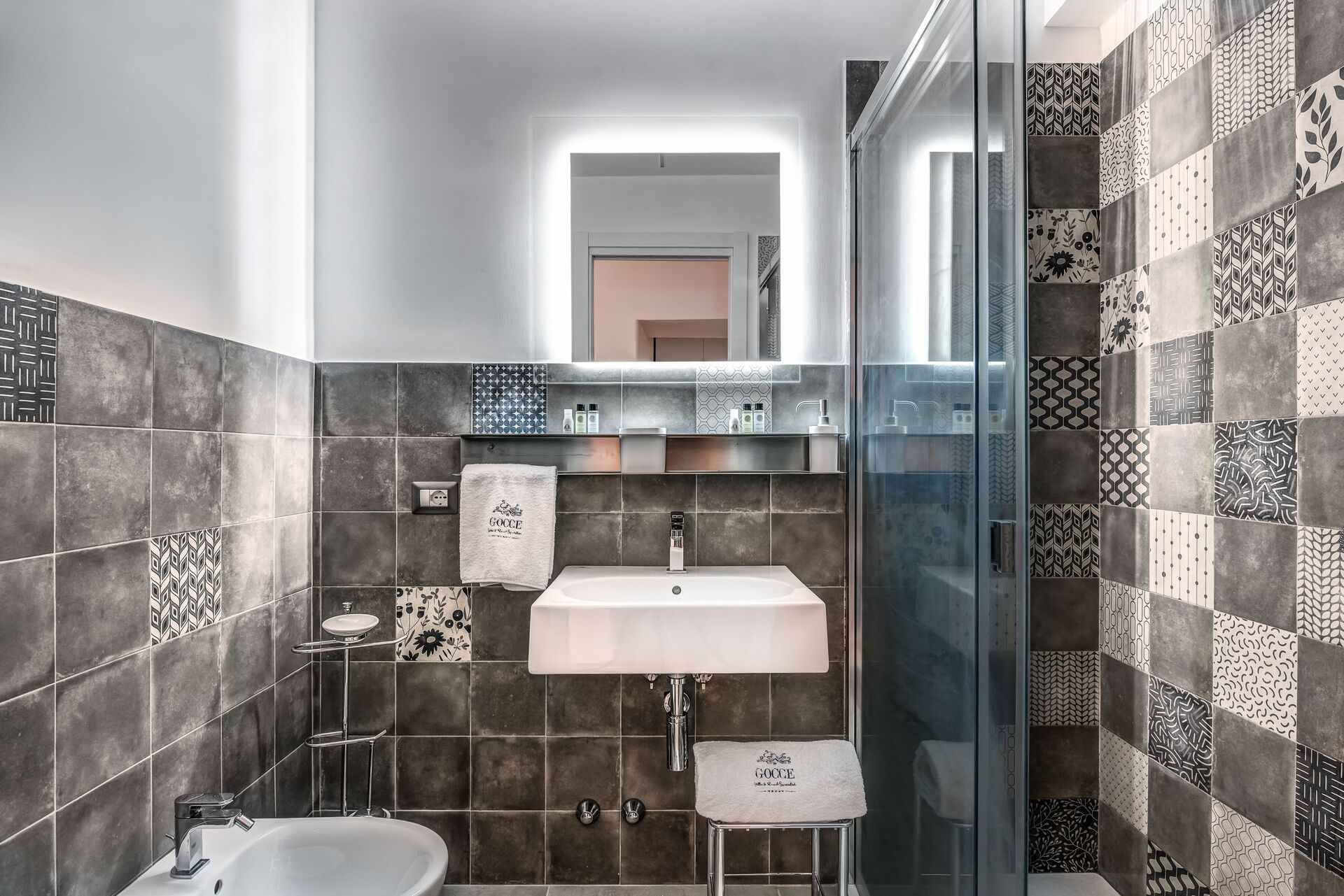 Badkamer: wastafel, toilet , bidet, douche.