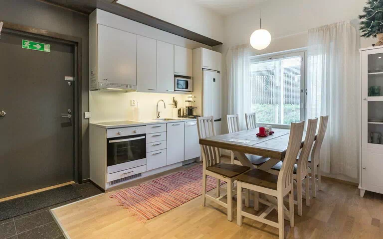 Cozy alpine style apartment, built in 2015 in the heart of Levi. The living areas are on two floors: The ground floor has 1 bedroom with 2 beds, a kitchen-living room and a dining area. A toilet with shower. Downstairs there is a spacious lounge area with two beds and convertible armchair bed for 1 person, a sauna and a washroom. From the ground floor also a passage out if necessary. Separate ski storage downstairs of the building. All services, skiing trails and slopes are within walking distance. Entrance from the street level. Charming decor.