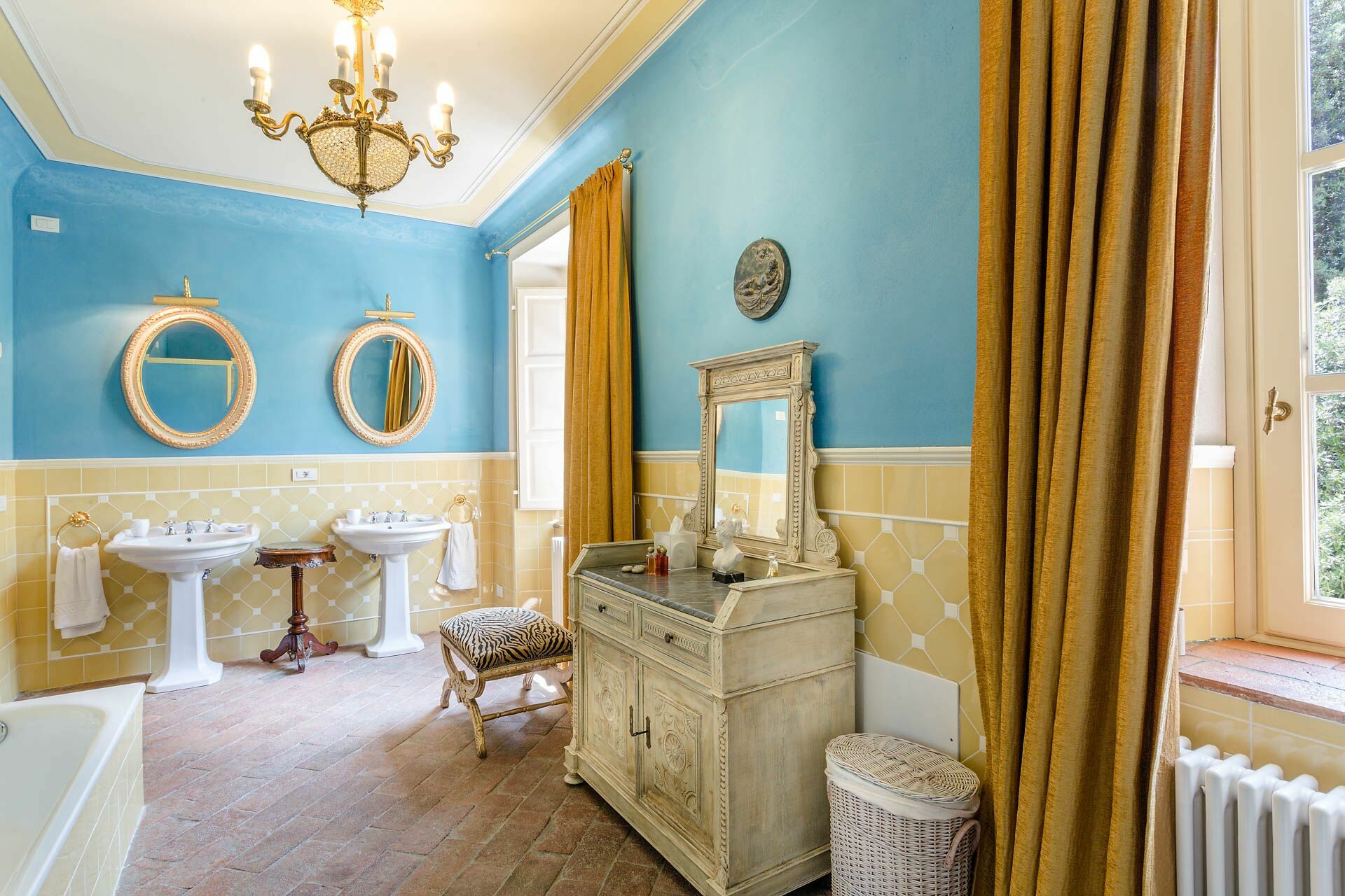 Slaapkamer met badkamer 1: tweepersoonsbed (breedte: 1.7m, lengte: 2m), airconditioning, dubbele wastafel, toilet , bidet, bad, douche.