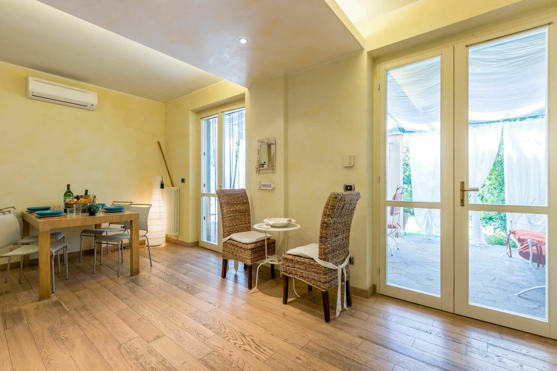 Woonkamer: bank, eettafel (personen: 6), airconditioning, tv, uitgang naar de tuin, uitgang naar de patio.