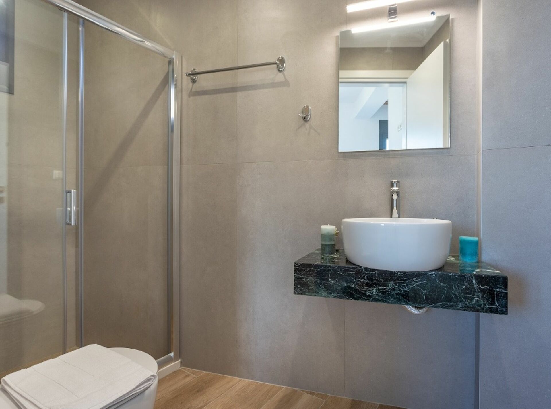 Slaapkamer met badkamer 2: tweepersoonsbed, airconditioning, kluis, wastafel, douche, haardroger, badkamer zonder raam, uitgang naar het balkon.