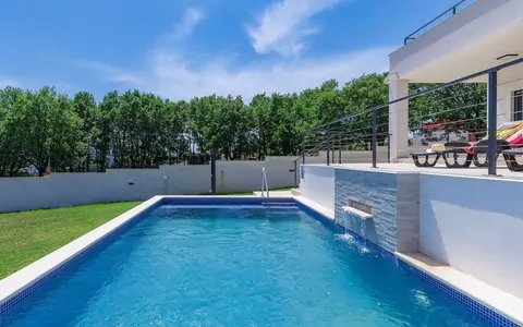 Moderne villa "Tara", van 2 verdiepingen. 1 km van het centrum van Medulin, 500 m van zee, 500 m van het strand. Voor alleengebruik: terrein 1.000 m2 (omheind), tuin met gazon, openluchtzwembad hoekig, verwarmd (8 x 4 m, 140 cm diepte, seizoensgebonden beschikbaarheid: 01.Apr. - 01.Nov.) met trap. Buitendouche. In het huis: internetaansluiting, wasmachine. Toegangsweg tot aan het huis (500 m onverharde weg). Parkeerplaats (voor 4 auto's) bij het huis op het terrein. Winkel, supermarkt 800 m, restaurant 1 km, bushalte 1 km, zandstrand 2 km, rotsstrand 500 m. De eigenaar accepteert geen jeugdgroepen. Zwembad verwarmd (extra). Als er zwembad verwarming nodig is, is het noodzakelijk om dit 7 dagen van te voren aan te geven.