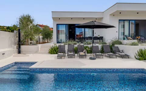 Moderne, mooi villa "Inizio". Zonnige ligging, 250 m van zee, 250 m van het strand. Voor alleengebruik: terrein 700 m2, openluchtzwembad hoekig (7 x 3 m, 27 m2, 150 cm diepte, seizoensgebonden beschikbaarheid: 15.Mei. - 15.Okt.) met trap. Buitendouche, barbecue. In het huis: internetaansluiting, wasmachine. Toegangsweg tot aan het huis (50 m onverharde weg). Parkeerplaats (voor 3 auto's) bij het huis op het terrein. Winkel 250 m, restaurant 260 m, bushalte 550 m, kiezelstrand 250 m, strandbad 900 m. Jachthaven 4 km. Attracties in de buurt: Aquapark 2 km, NP Krka 17 km.