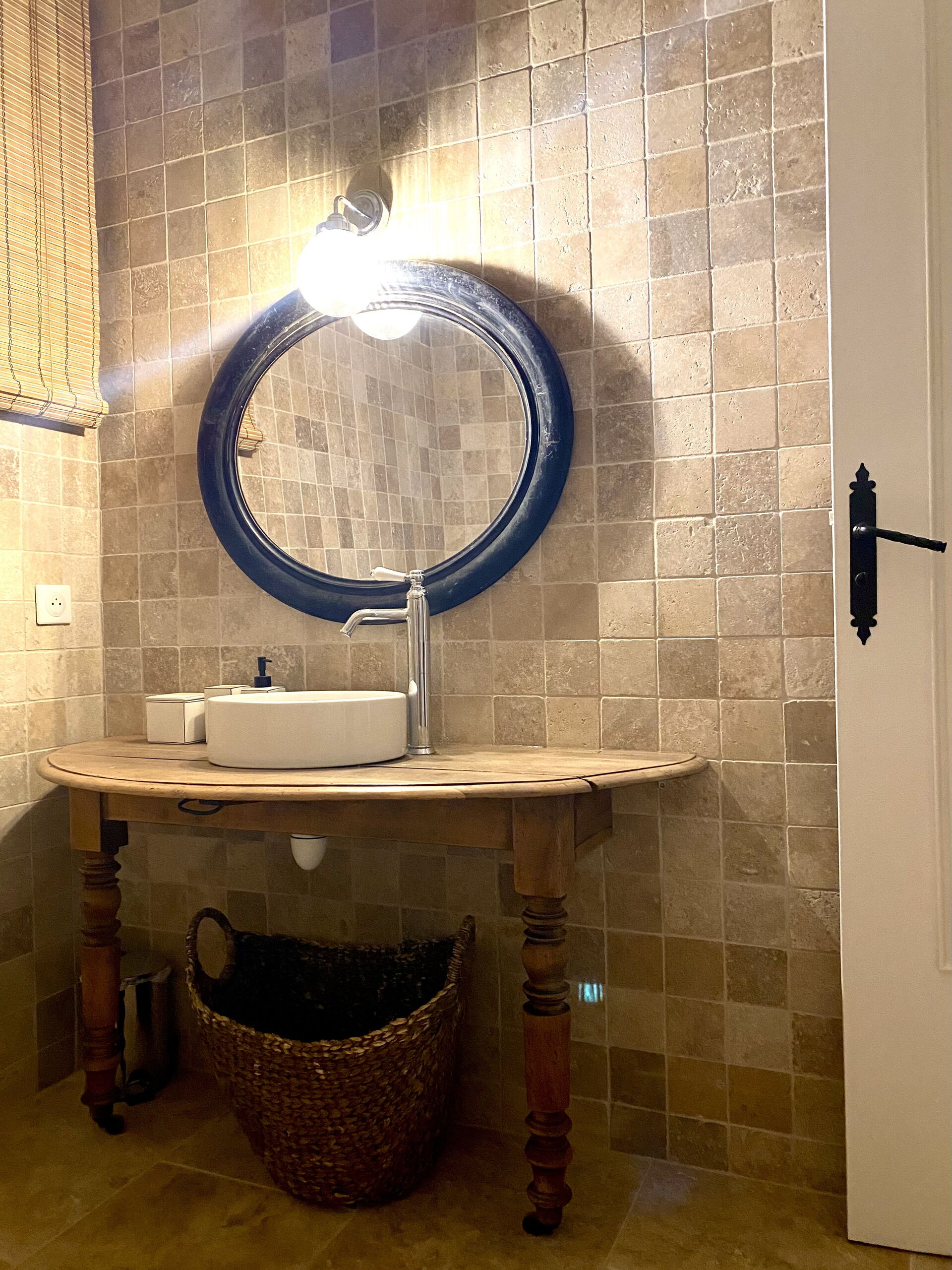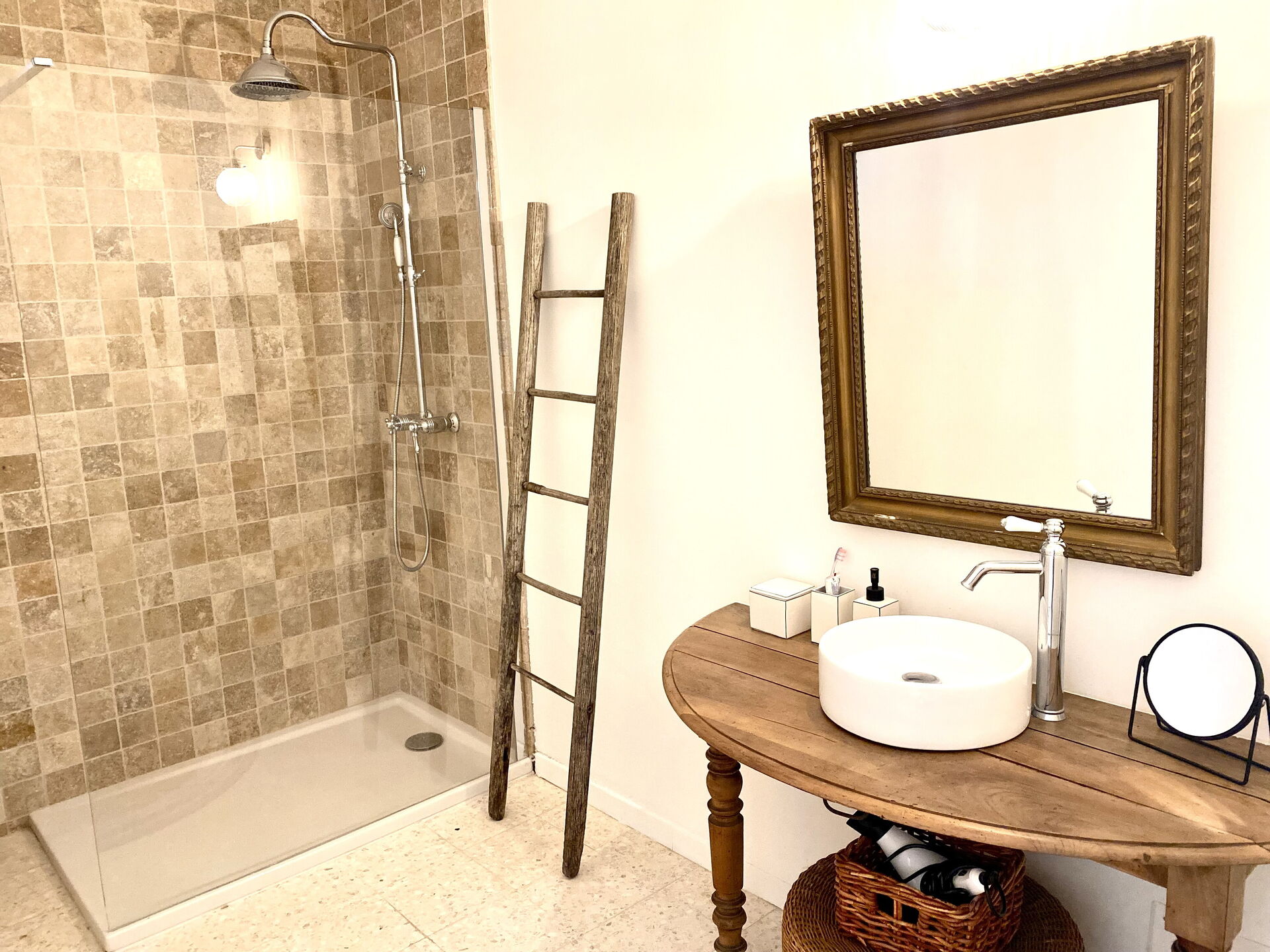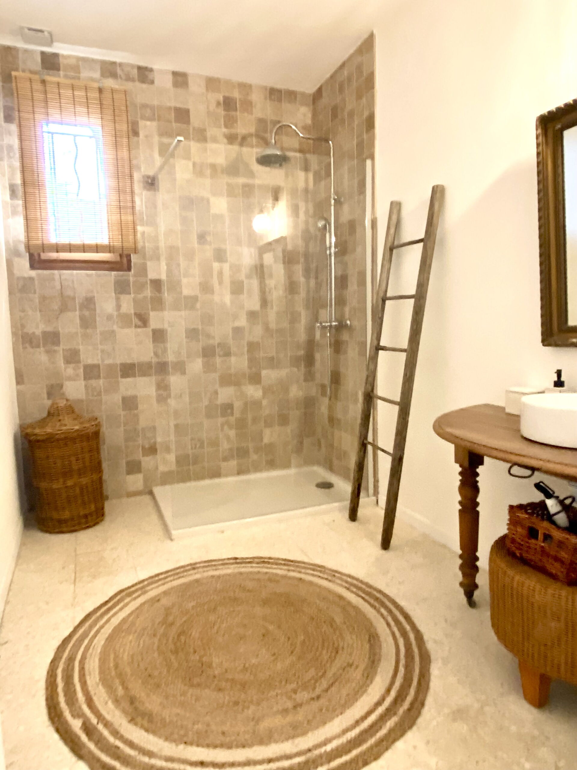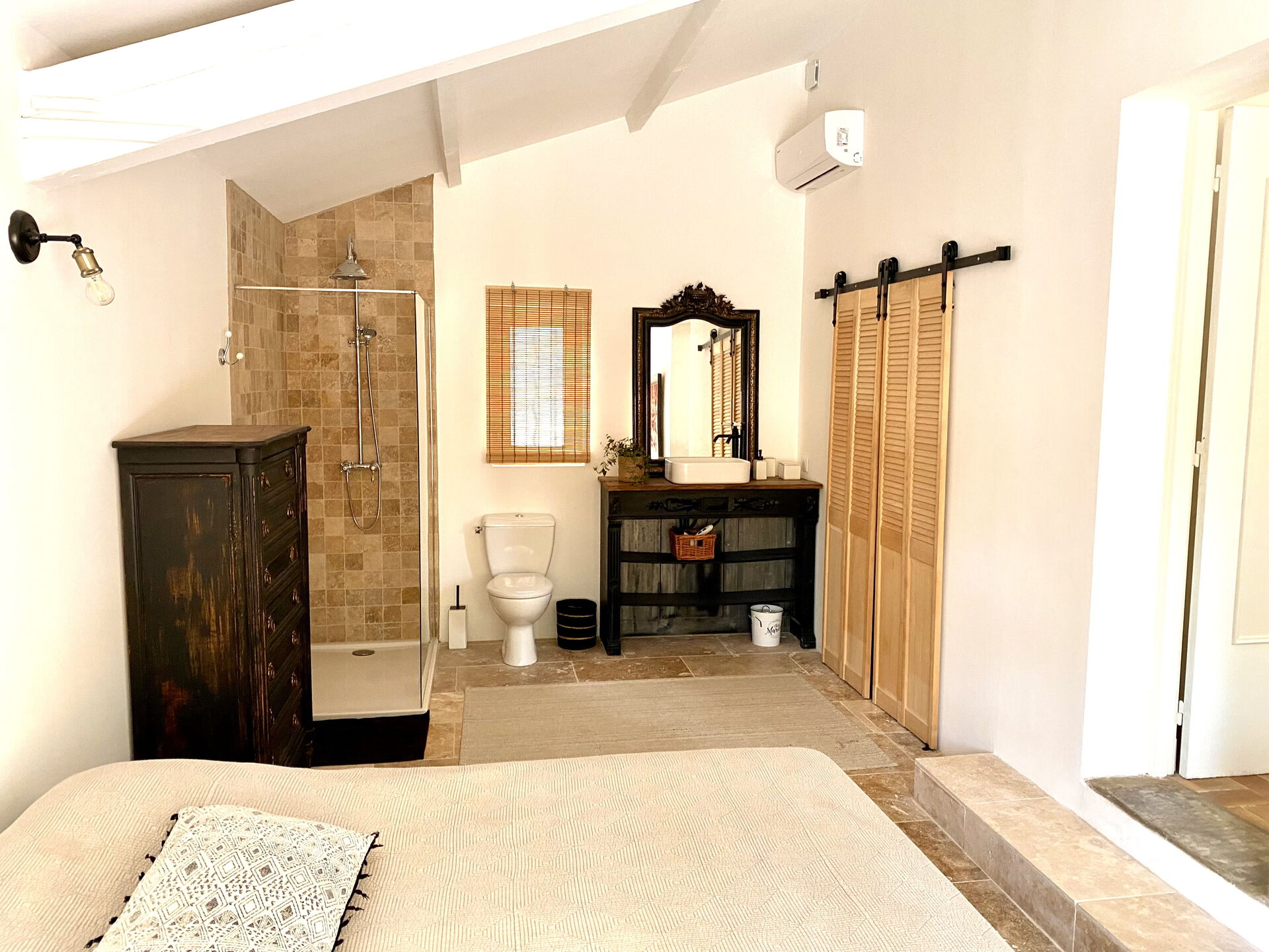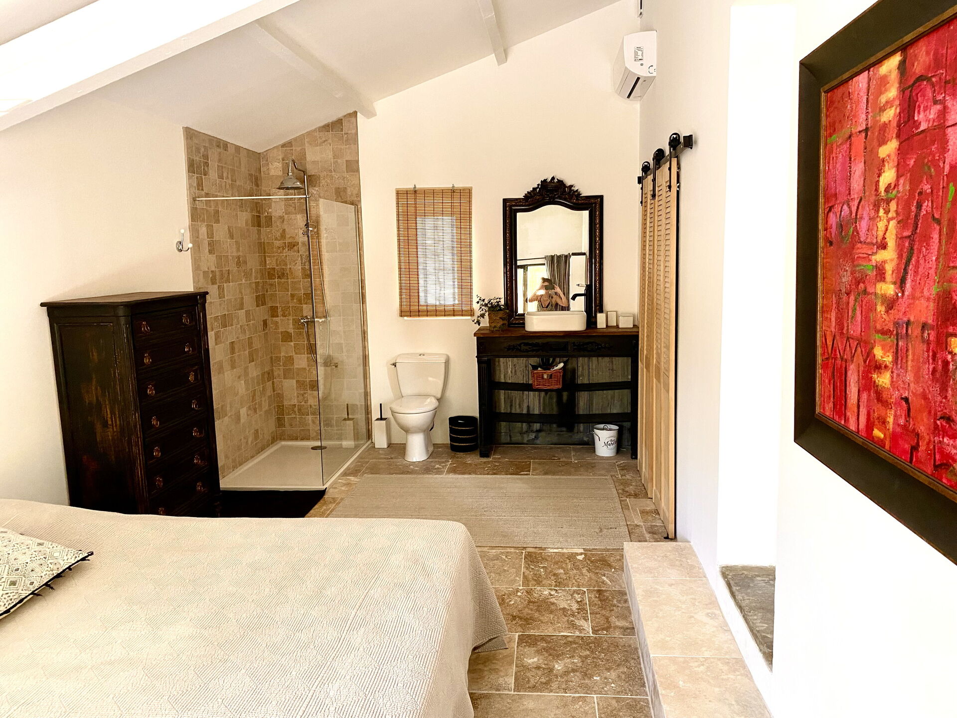 Slaapkamer met badkamer (25 m2): tweepersoonsbed (breedte: 1.6m, lengte: 2m), internet, airconditioning, wastafel, toilet , douche, haardroger, uitgang naar de tuin.