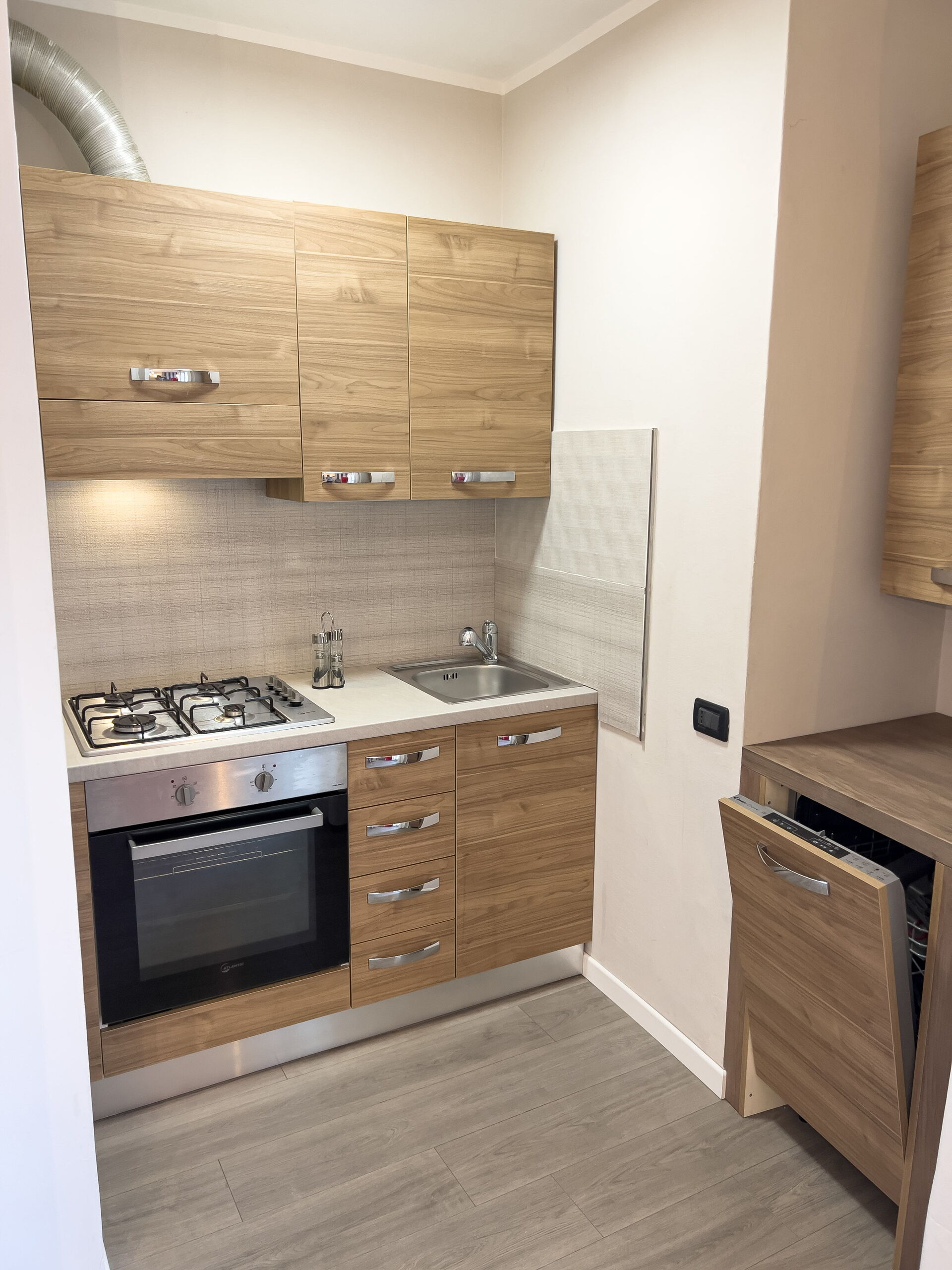 Het appartement heeft een woonkeuken met eettafel, kitchenette met vaatwasser, slaapbank en tv.
