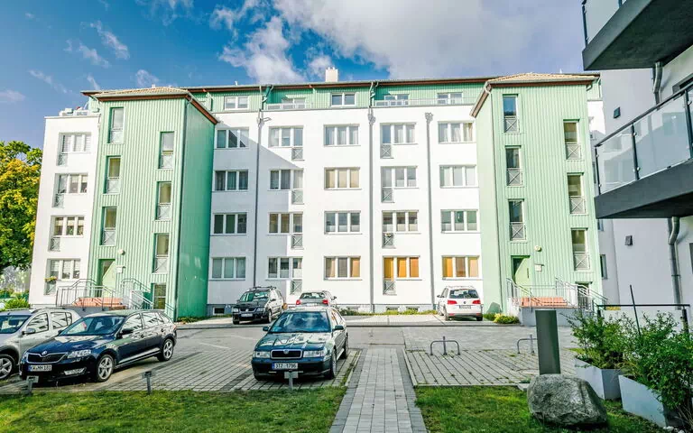 Appartementencomplex van 4 verdiepingen. In de plaats, 500 m van het centrum van Zinnowitz, 100 m van zee, van het strand. In het huis: lift, bergruimte voor fietsen, centrale verwarming. Parkeerplaats bij het huis. Supermarkt 650 m, bakkerij 270 m, café 270 m, bushalte 110 m, treinstation 1 km, zandstrand 100 m, thermaalbad "Bernsteintherme" 240 m. Jachthaven 2.6 km, golfterrein (18 holes) 25 km, surfschool 240 m, tennis 750 m, midgetgolf. Lift tot de 3e verdieping.