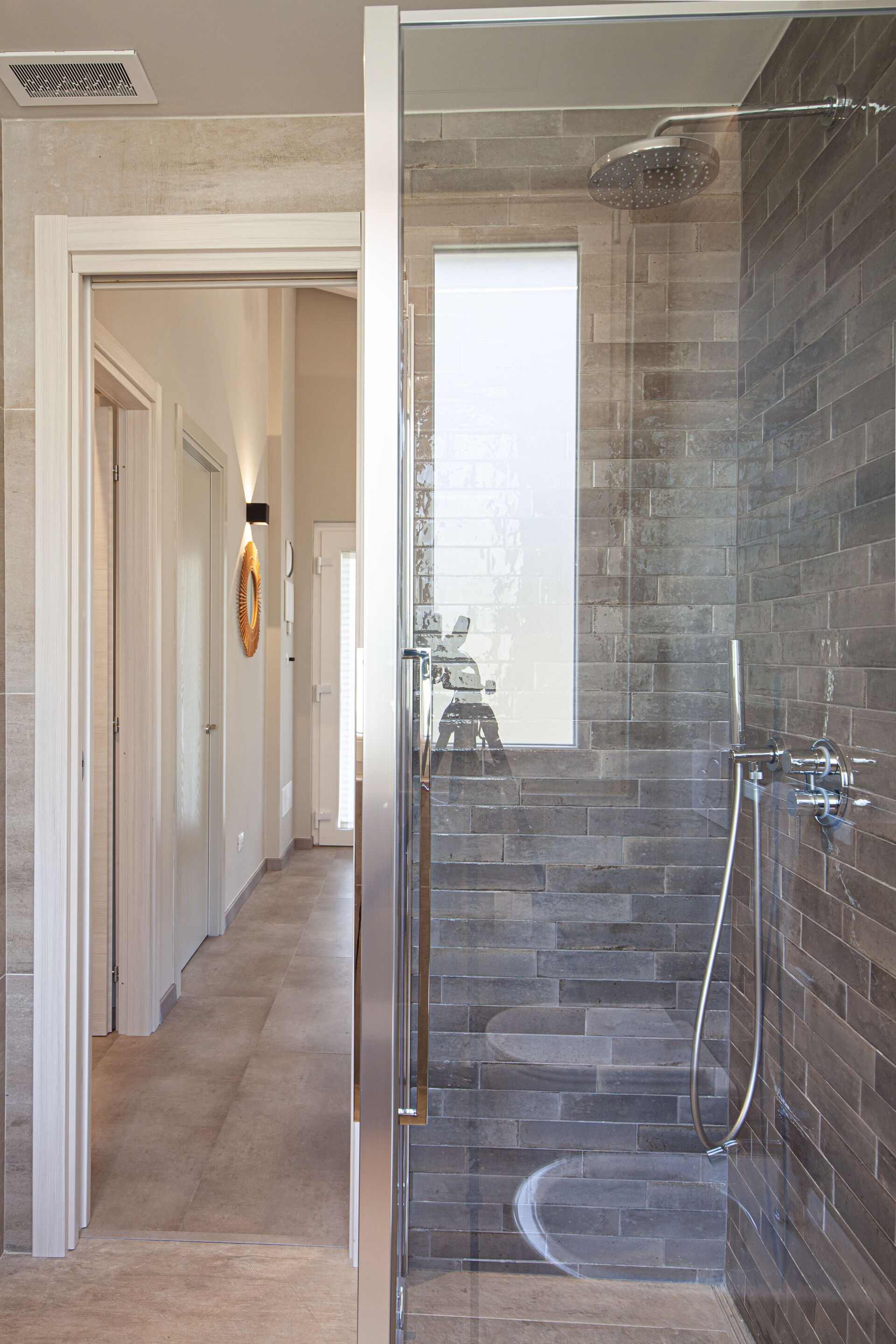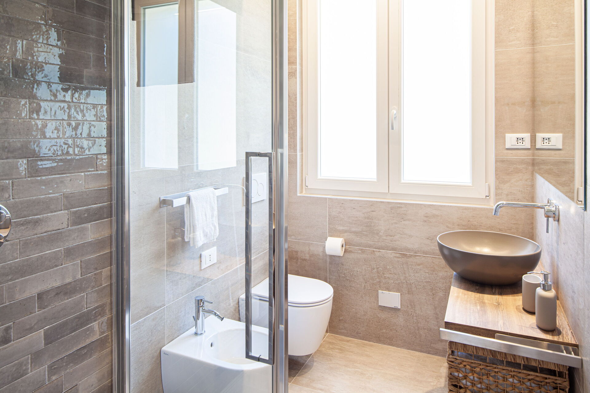 - Badkamer met wastafel, douche, toilet en bidet.