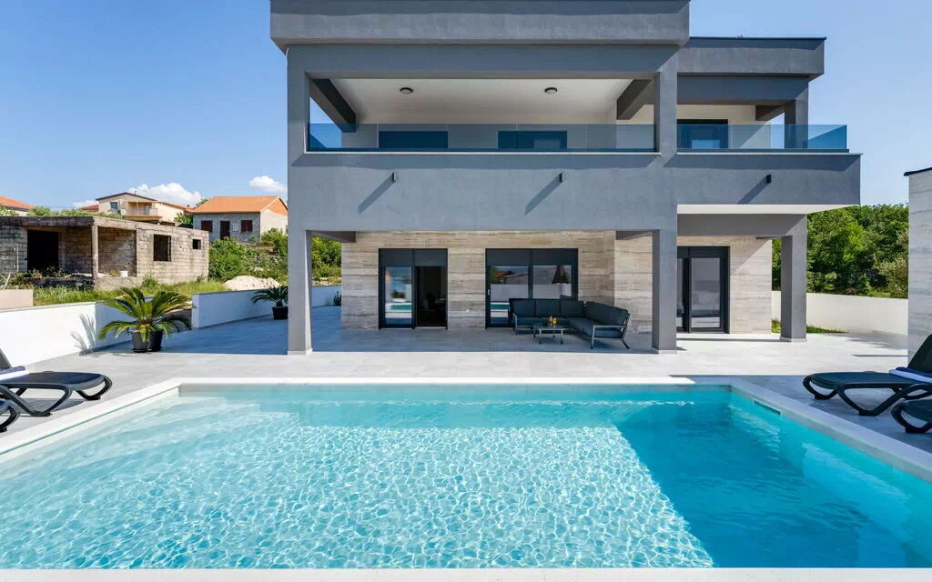 Moderne villa "Solis", van 2 verdiepingen, bouwjaar 2024. 28 km van het centrum van Zadare, zonnige, verhoogde ligging, 400 m van zee, 400 m van het strand, aan een weg. Voor alleengebruik: terrein 600 m2 (omheind), openluchtzwembad hoekig (8 x 4 m, 150 cm diepte, seizoensgebonden beschikbaarheid: 02.Mei. - 26.Sep.). Tuinmeubelen, barbecue. In het huis: internetaansluiting, wasmachine. Parkeerplaats bij het huis op het terrein. Winkel 100 m, restaurant 400 m, bushalte 900 m, kiezelstrand 500 m. Attracties in de buurt: NP Paklenica 17 km, rafting Zrmanja 35 km. Groepen jongeren uitsluitend op aanvraag.