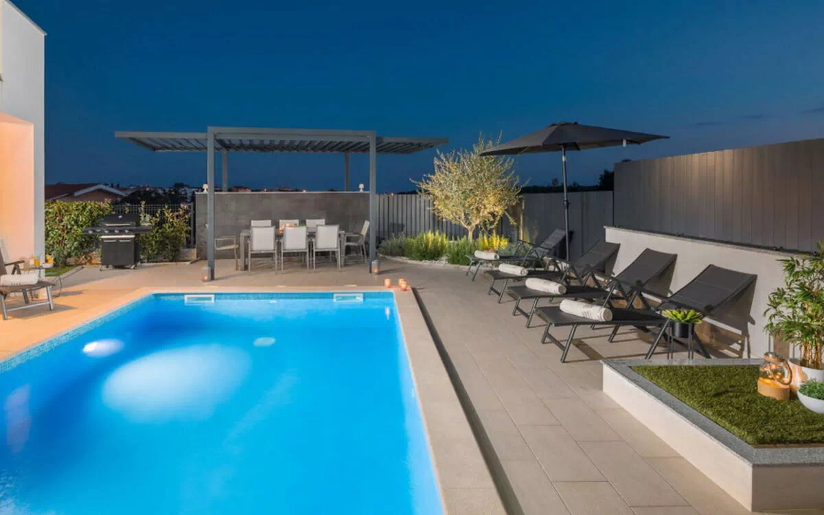 Villa "Freya", van 2 verdiepingen. 1 km van het centrum van Medulin, 12 km van het centrum van Pula, 150 m van zee, 150 m van het strand. Voor alleengebruik: terrein 570 m2 (omheind) met gazon, openluchtzwembad hoekig (7 x 4 m, 28 m2, 140 cm diepte, seizoensgebonden beschikbaarheid: 01.Mei. - 01.Okt.). Buitendouche, terras (20 m2), tuinmeubelen, barbecue (schommel). In het huis: internetaansluiting, tafeltennis, biljart, speelkamer, wasmachine. Parkeerplaats (voor 3 auto's) bij het huis op het terrein. Levensmiddelenwinkel 500 m, supermarkt 1 km, restaurant 300 m, bushalte 1 km, kiezelstrand, stenenstrand 150 m. Jachthaven 1.5 km. Vliegveld 9 km van het huis.