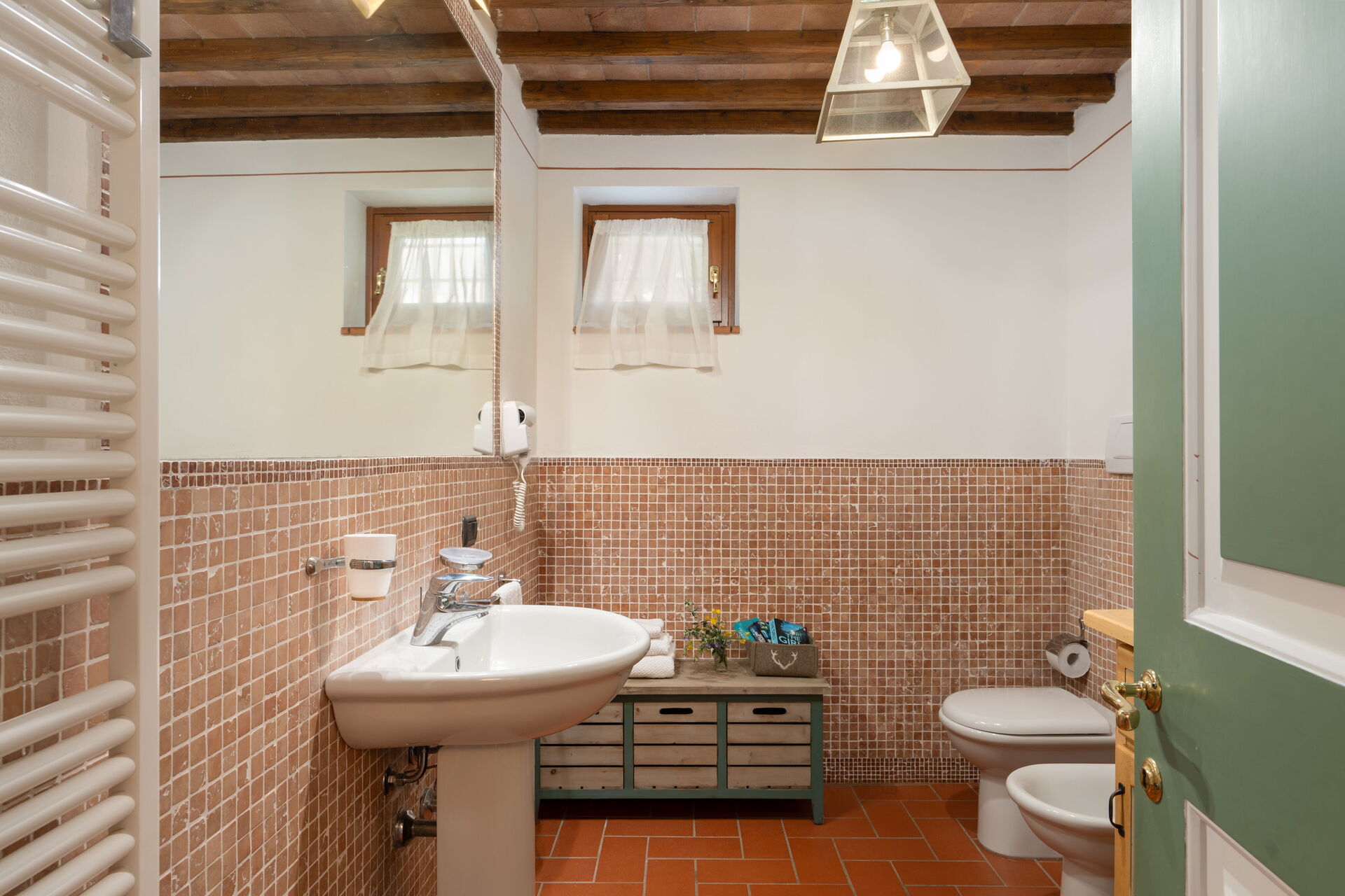 Badkamer: wastafel, toilet , bidet, douche, haardroger.