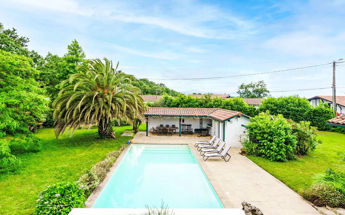 Saint Pée sur Nivelle 12 km van Saint Jean de Luz: Zeer mooi eengezinswoning "Hegoasea". In de wijk, rustige ligging, 8 km van zee, 8 km van het strand, te midden van groen. Voor alleengebruik: tuin 1.900 m2 (omheind), openluchtzwembad hoekig (10 x 5 m, 210 cm diepte, seizoensgebonden beschikbaarheid: 01.Jul. - 31.Aug.) met oprolbaar afdekscherm. Douche/WC bij het zwembad, jeu de boules, terras (15 m2), barbecue. Bushalte 1.8 km, treinstation 7 km. De sleuteloverdracht vindt plaats bij het agentschap Interhome in Saint Jean de Luz, 8 km.
