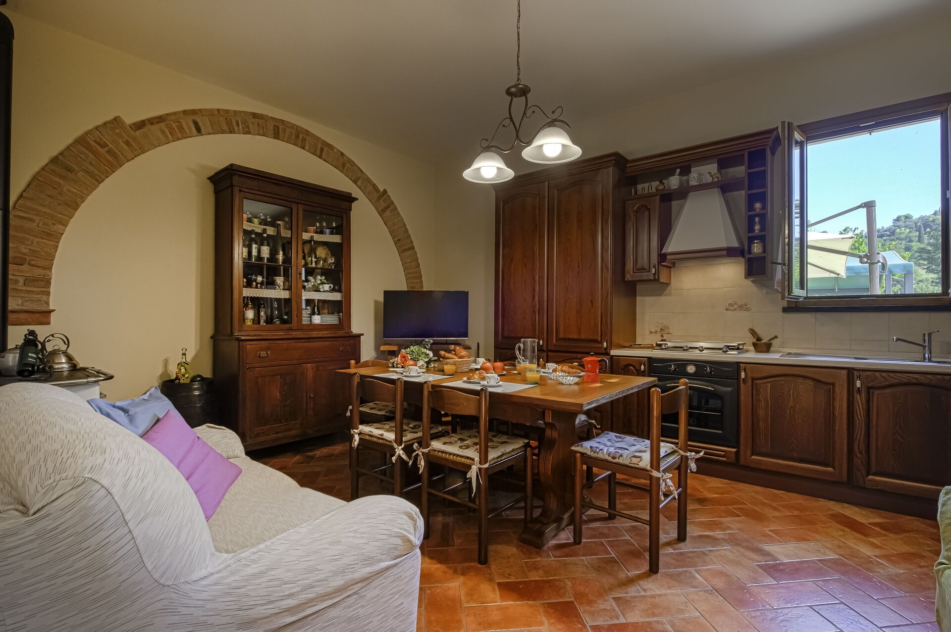 Keuken – woonkamer: goed uitgeruste keuken, eettafel, ijskast, diepvriezer, magnetron, kookplaat, oven, italiaans koffiezetapparaat, tweepersoons-slaapbank, WIFI internet, satelliet tv, uitgang naar de tuin.