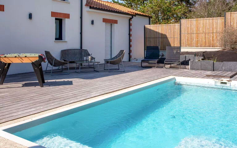 Mooi villa "Ker Rohan", van 2 verdiepingen, bouwjaar 2022, omgeven door bomen. In de plaats, 1 km van het centrum van la Bernerie en Retz, perfecte locatie: in het centrum en toch rustig gelegen, 300 m van zee, 300 m van het strand, op het zuidwesten. Voor alleengebruik: terrein 800 m2 (omheind), verzorgde tuin, openluchtzwembad hoekig, verwarmd (6 x 3 m, 30 - 150 cm diepte, seizoensgebonden beschikbaarheid: 15.Jun. - 15.Sep.) met trap en oprolbaar afdekscherm. Terras, tuinmeubelen, barbecue, parkeerplaats (voor 2 auto's) op het terrein, eigen garage. Winkel 1 km, restaurant 1 km, bakkerij 1 km, centrum te voet bereikbaar in 10 minuten, bushalte "Bourg de la Bernerie en Retz" 1 km, treinstation "La Bernerie en Retz" 2 km, zandstrand "Plage de Creve Coeur" 300 m, thermaalbad "Alliance Pornic Thalasso & Spa" 8 km. Jachthaven 6 km, golfterrein (18 holes) 9 km, midgetgolf 9 km. Attracties in de buurt: Plan d'Eau de la Bernerie 1.5 km, Pornic 6 km, Planète Sauvage 27 km, Nantes 48 km, La Baule 48 km, Ile de Noirmoutier 54 km. Bekende meren kunnen gemakkelijk worden bereikt: Lac de Saint Viaud 21 km. Wandelgebied Sentier des Douaniers 100 m. Baby uitrusting (incl.). De eigenaar accepteert geen jeugdgroepen. Een deel van het huis is afgesloten en niet bezet.