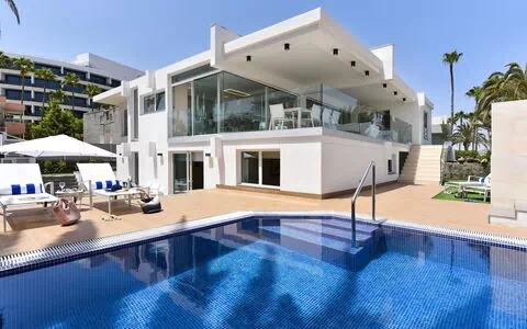 Zeer moderne huis. In het centrum van Maspalomas, centrale ligging. Voor alleengebruik: openluchtzwembad hoekig, verwarmd (120 - 120 cm diepte, seizoensgebonden beschikbaarheid: 01.Jan. - 31.Dec.). Bushalte "Estación Faro de Maspalomas" 450 m.