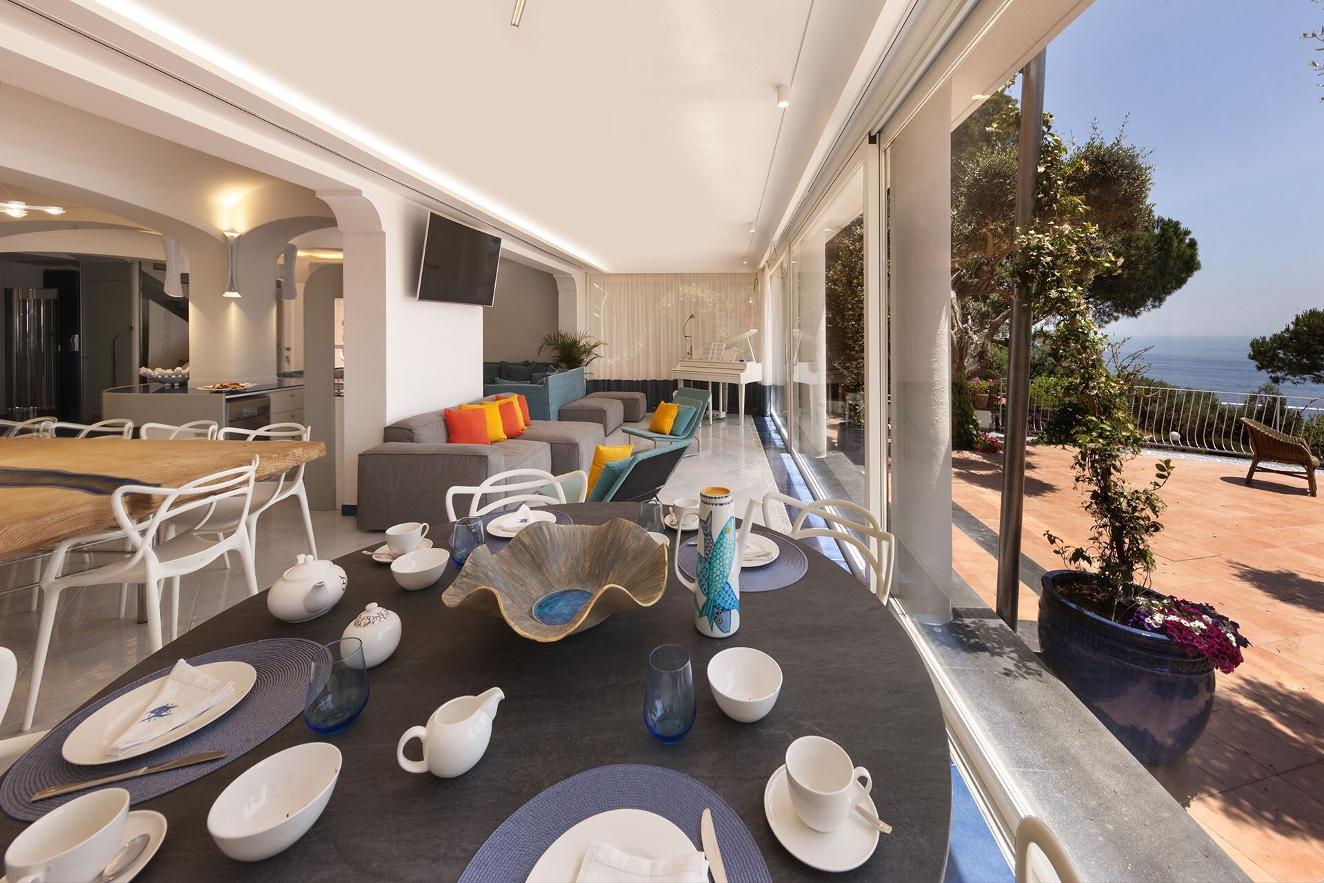 Villa Nerano is uitgerust met uitgebreide klimaatbeheersing, met airconditioning door het hele pand om comfort te garanderen tijdens warme mediterrane zomers, terwijl beschikbare verwarming warmte biedt tijdens koelere maanden. Entertainmentopties omvatten satelliet-tv en televisiesystemen geïnstalleerd in elke slaapkamer evenals de gemeenschappelijke woonruimtes, aangevuld met een geavanceerd Bose-stereosysteem dat uitzonderlijke geluidskwaliteit levert door de hele villa voor achtergrondmuziek of levendiger entertainment. De keuken is uitgerust met moderne apparatuur waaronder een vaatwasser voor moeiteloos opruimen en een magnetron voor gemakkelijke maaltijdbereiding, naast een koel-vriescombinatie, oven, sapcentrifuge en andere hoogwaardige kookapparatuur. Een wasmachine bevindt zich op een handige locatie in de speciale wasruimte, wat langere verblijven comfortabeler maakt. Liefhebbers van buitenkoken zullen de barbecuefaciliteiten in de overdekte veranda waarderen, perfect voor het bereiden van gegrilde specialiteiten terwijl u geniet van de kustsfeer. Het pand beschikt over een stijlvolle open haard die warmte en ambiance toevoegt aan de woonruimtes. Extra luxe voorzieningen omvatten 2 Teuco hydromassagebaden, minikoelkasten en kluizen in elke slaapkamer, en een openlucht-jacuzzi. Elke slaapkamer is uitgerust met een eigen satelliettelevisie voor privékijken, waardoor entertainmentopties beschikbaar zijn in zowel gemeenschappelijke als privéruimtes.
